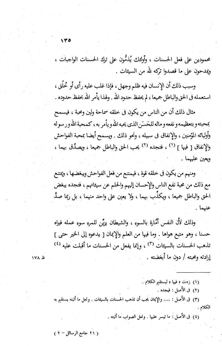 وذلك لأن النفس أمارة بالسوء والشيطان يزين للمرء سوء عمله فيراه حسنا وهو متبع هواها وما فيها من العلم والإيمان يدعوه إلى الخير حتى تذهب الحسنات بالسيئات وإنما يفعل من الحسنات ما أقبلت عليه إرادته ومحبته دون ما أبغضته