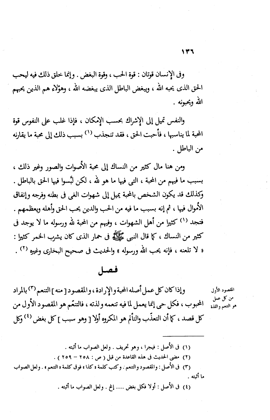 وإذا كان كل عمل أصله المحبة والإرادة والمقصود منه التنعم بالمراد المحبوب فكل حي إنما يعمل لما فيه تنعمه ولذته فالتنعم هو المقصود الأول من كل قصد كما أن التعذب والتألم هو المكروه أولا وهو سبب كل بغض وكل