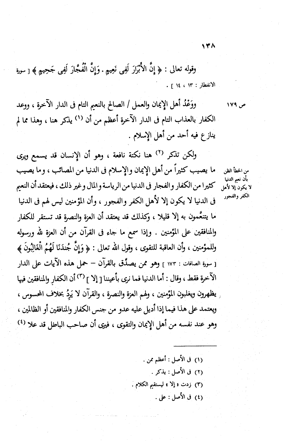 ولكن تذكر هنا نكتة نافعة وهو أن الإنسان قد يسمع ويرى ما يصيب كثيرا من أهل الإيمان والإسلام في الدنيا من المصائب وما يصيب كثيرا من الكفار والفجار في الدنيا من الرياسة والمال وغير ذلك فيعتقد أن النعيم في الدنيا لا يكون إلا لأهل الكفر والفجور وأن المؤمنين ليس لهم في الدنيا ما يتنعمون به إلا قليلا وكذلك قد يعتقد أن العزة والنصرة قد تستقر للكفار والمنافقين على المؤمنين وإذا سمع ما جاء في القرآن من أن العزة لله ورسوله وللمؤمنين وأن العاقبة للتقوى وقول الله تعالى: {وَإِنَّ جُنْدَنَا لَهُمُ الْغَالِبُونَ} وهو ممن يصدق بالقرآن حمل هذه الآيات على الدار الآخرة فقط وقال أما الدنيا فما نري بأعيننا إلا أن الكفار والمنافقين فيها يظهرون ويغلبون المؤمنين ولهم العزة والنصرة والقرآن لا يرد بخلاف المحسوس ويعتمد على هذا فيما إذا أديل أديل عليه عدو من جنس الكفار والمنافقين أو الظالمين وهو عند نفسه من أهل الإيمان والتقوى فيرى أن صاحب الباطل قد علا