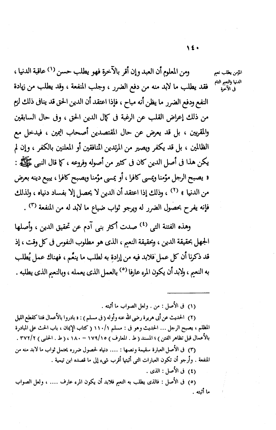 ومن المعلوم أن العبد وإن أقر بالآخرة فهو يطلب حسن عاقبة الدنيا فقد يطلب ما لا بد منه من دفع الضرر وجلب المنفعة وقد يطلب من زيادة النفع ودفع الضرر ما يظن أنه مباح فإذا اعتقد أن الدين الحق قد ينافي ذلك لزم من ذلك إعراض القلب عن الرغبة في كمال الدين الحق وفي حال السابقين والمقربين بل قد يعرض عن حال المقتصدين أصحاب اليمين فيدخل مع الظالمين بل قد يكفر ويصير من المرتدين المنافقين أو المعلنين بالكفر وإن لم يكن هذا في أصل الدين كان في كثير من أصوله وفروعه كما قال النبي صلى الله عليه وسلم: "يصبح الرجل مؤمنا ويمسى كافرا أو يمسى مؤمنا ويصبح كافرا يبيع دينه بعرض من الدنيا " وذلك إذا اعتقد أن الدين لا يحصل إلا بفساد دنياه ولذلك فإنه يفرح بحصول الضرر له ويرجو ثواب ضياع ما لا بد له من المنفعة