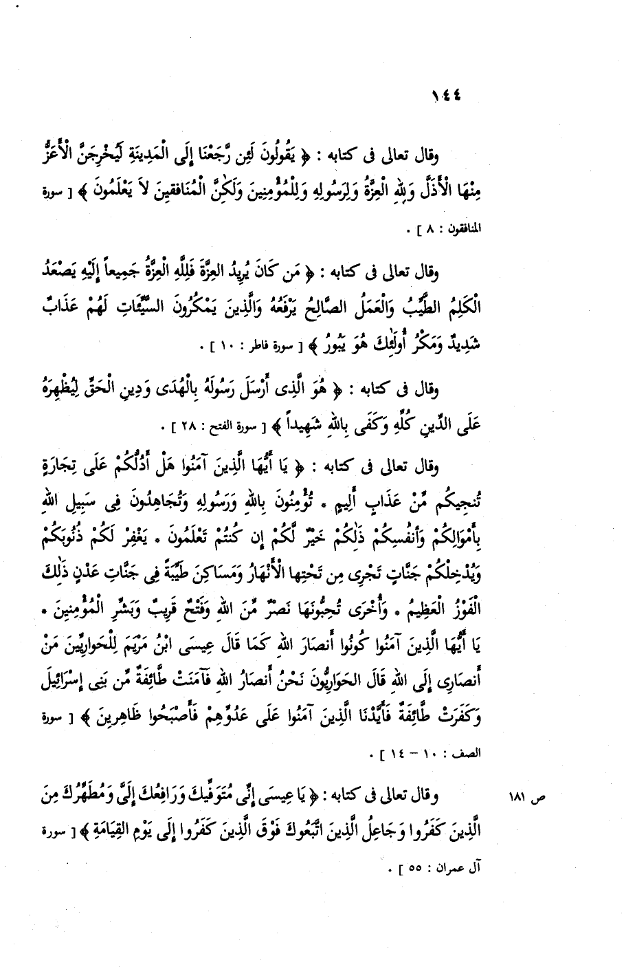 وقال تعالى: في كتابه {يَا أَيُّهَا الَّذِينَ آَمَنُوا هَلْ أَدُلُّكُمْ عَلَى تِجَارَةٍ تُنجِيكُم مِّنْ عَذَابٍ أَلِيمٍ. تُؤْمِنُونَ بِاللَّهِ وَرَسُولِهِ وَتُجَاهِدُونَ فِي سَبِيلِ اللَّهِ بِأَمْوَالِكُمْ وَأَنفُسِكُمْ ذَلِكُمْ خَيْرٌ لَّكُمْ إِن كُنتُمْ تَعْلَمُونَ. يَغْفِرْ لَكُمْ ذُنُوبَكُمْ وَيُدْخِلْكُمْ جَنَّاتٍ تَجْرِي مِن تَحْتِهَا الْأَنْهَارُ وَمَسَاكِنَ طَيِّبَةً فِي جَنَّاتِ عَدْنٍ ذَلِكَ الْفَوْزُ الْعَظِيمُ. وَأُخْرَى تُحِبُّونَهَا نَصْرٌ مِّنَ اللَّهِ وَفَتْحٌ قَرِيبٌ وَبَشِّرِ الْمُؤْمِنِينَ. يَا أَيُّهَا الَّذِينَ آَمَنُوا كُونوا أَنصَارَ اللَّهِ كَمَا قَالَ عِيسَى ابْنُ مَرْيَمَ لِلْحَوَارِيِّينَ مَنْ أَنصَارِي إِلَى اللَّهِ قَالَ الْحَوَارِيُّونَ نَحْنُ أَنصَارُ اللَّهِ فَآَمَنَت طَّائِفَةٌ مِّن بَنِي إِسْرَائِيلَ وَكَفَرَت طَّائِفَةٌ فَأَيَّدْنَا الَّذِينَ آَمَنُوا عَلَى عَدُوِّهِمْ فَأَصْبَحُوا ظَاهِرِينَ}