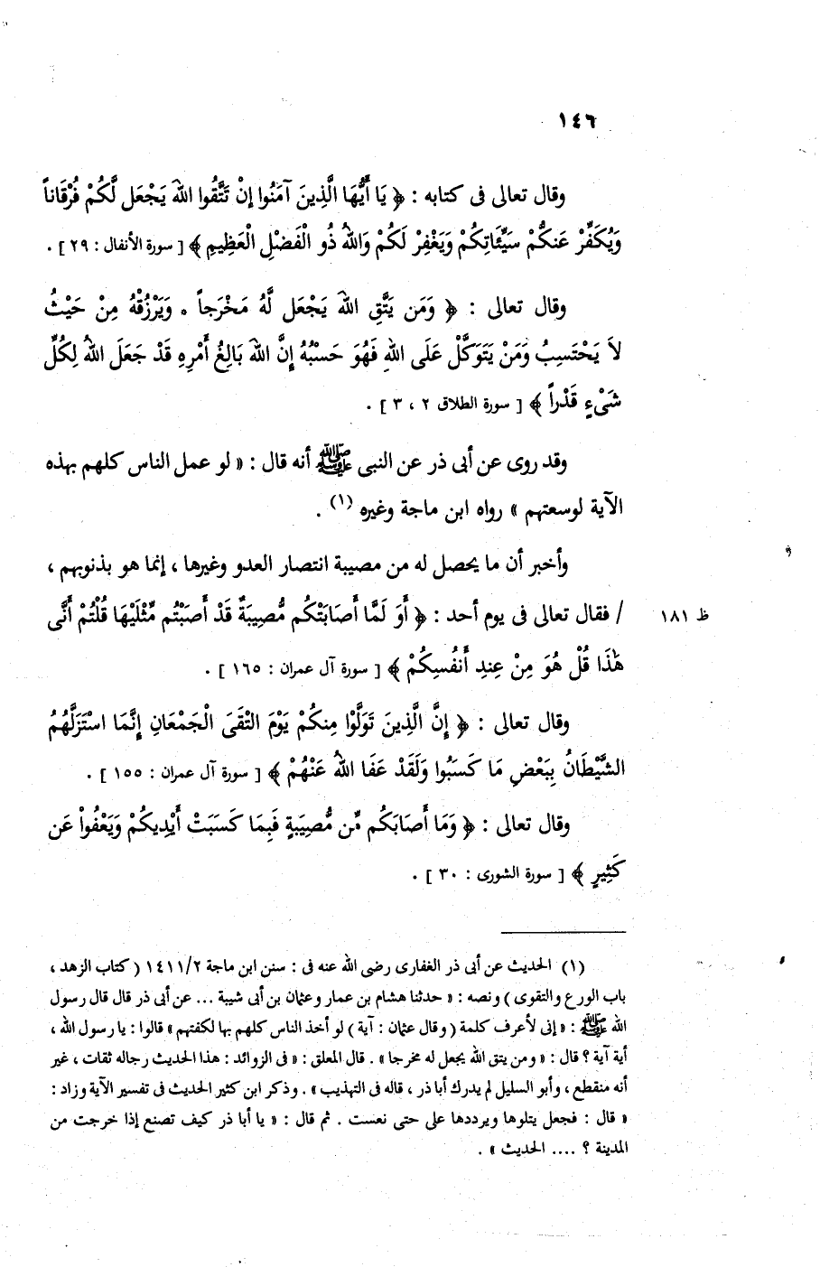 وقد روي عن أبى ذر عن النبي صلى الله عليه وسلم أنه قال: " لو عمل الناس كلهم بهذه الآية لوسعتهم". رواه ابن ماجه وغيره