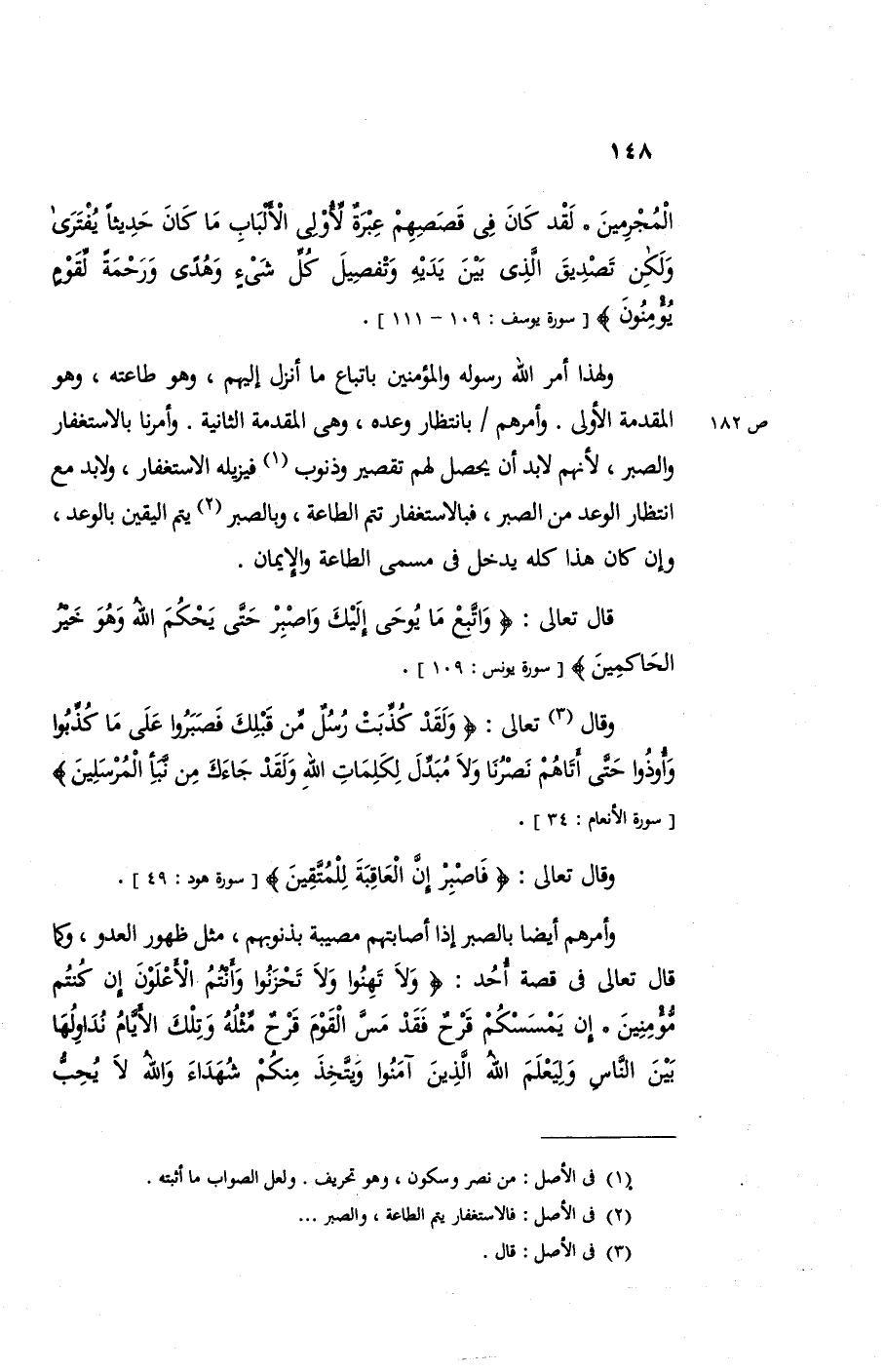 ولهذا أمر الله رسوله والمؤمنين باتباع ما أنزل إليهم وهو طاعته وهو المقدمة الأولى وأمرهم بانتظار وعده وهى المقدمة الثانية وأمرنا بالاستغفار والصبر لأنهم لابد أن يحصل لهم تقصير وذنوب فيزيله الاستغفار ولابد مع انتظار الوعد من الصبر فبالاستغفار تتم الطاعة وبالصبر يتم اليقين بالوعد إن كان هذا كله يدخل في مسمى الطاعة والإيمان