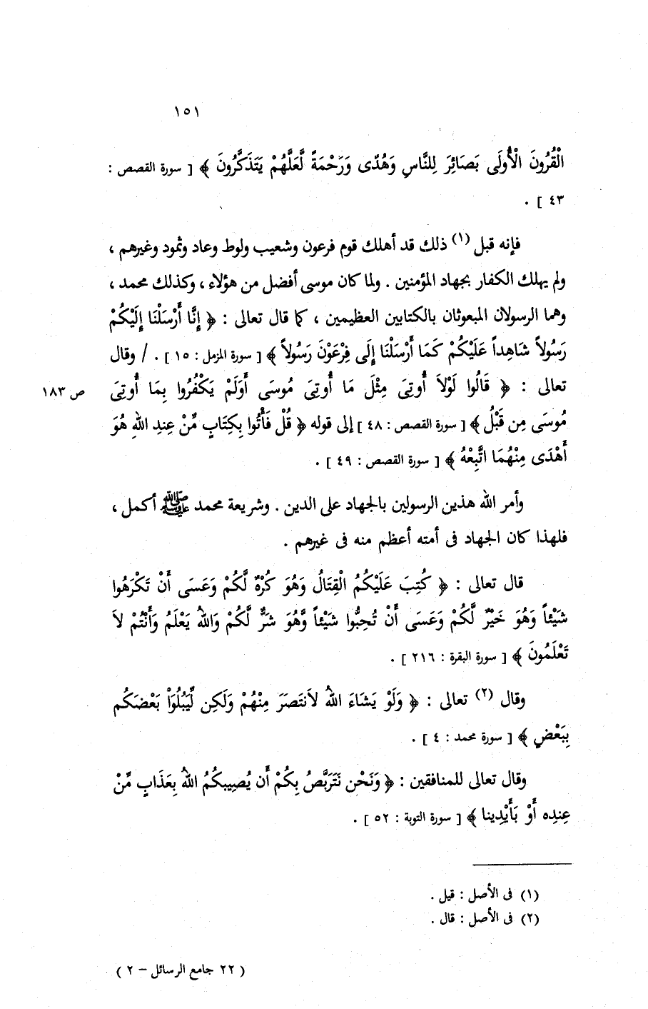فإنه قبل ذلك قد أهلك قوم فرعون وشعيب لوط وعاد وثمود وغيرهم ولم يهلك الكفار بجهاد المؤمنين ولما كان موسى أفضل من هؤلاء وكذلك محمد وهما الرسولان المبعوثان بالكتابين العظيمين كما قال تعالى: {إِنَّا أَرْسَلْنَا إِلَيْكُمْ رَسُولاً شَاهِداً عَلَيْكُمْ كَمَا أَرْسَلْنَا إِلَى فِرْعَوْنَ رَسُولاً} وقال تعالى: {قَالُوا لَوْلا أُوتِيَ مِثْلَ مَا أُوتِيَ مُوسَى أَوَلَمْ يَكْفُرُوا بِمَا أُوتِيَ مُوسَى مِنْ قَبْلُ} إلى قوله {قُلْ فَأْتُوا بِكِتَابٍ مِنْ عِنْدِ اللَّهِ هُوَ أَهْدَى مِنْهُمَا أَتَّبِعْهُ}