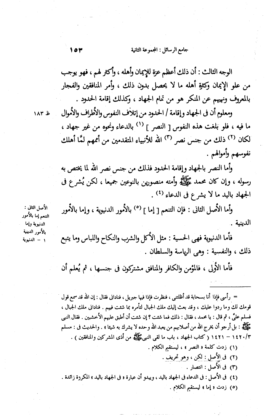 الوجه الثالث أن ذلك أعظم عزة للإيمان وأهله وأكثر لهم فهو يوجب من علو الإيمان وكثرة أهله ما لا يحصل بدون ذلك وأمر المنافقين والفجار بالمعروف ونهيهم عن المنكر هو من تمام الجهاد وكذلك إقامة الحدود