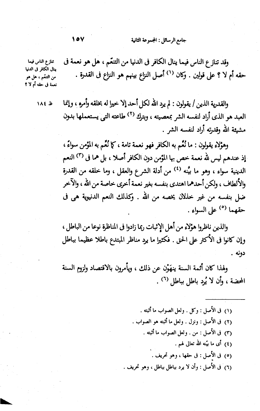 وهؤلاء يقولون ما نعم به الكافر فهو نعمة تامة كما نعم به المؤمن سواء إذ عندهم ليس لله نعمة خص بها المؤمن دون الكافر أصلا بل هما في النعم الدينية سواء وهو ما بينه من أدلة الشرع والعقل وما خلقه من القدرة والألطاف ولكن أحدهما اهتدي بنفسه بغير نعمة أخري خاصة من الله والآخر ضل بنفسه من غير خذلان يخصه من الله وكذلك النعم الدنيوية هي في حقهما على السواء
