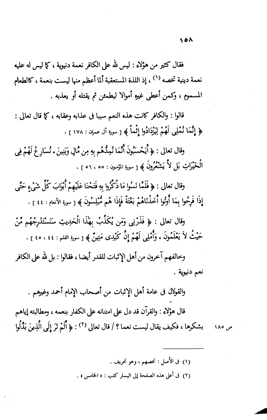 وخالفهم آخرون من أهل الإثبات للقدر أيضا فقالوا بل لله على الكافر نعم دنيوية