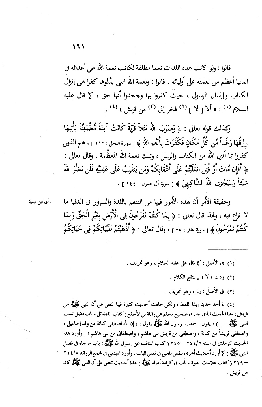 قالوا ولو كانت هذه اللذات نعما مطلقة لكانت نعمة الله على أعدائه في الدنيا أعظم من نعمته على أوليائه قالوا ونعمة الله التي بدلوها كفرا هي إنزال الكتاب وإرسال الرسول حيث كفروا بها وجحدوا أنها حق كما قال عليه السلام ألا لا فخر إني من قريش