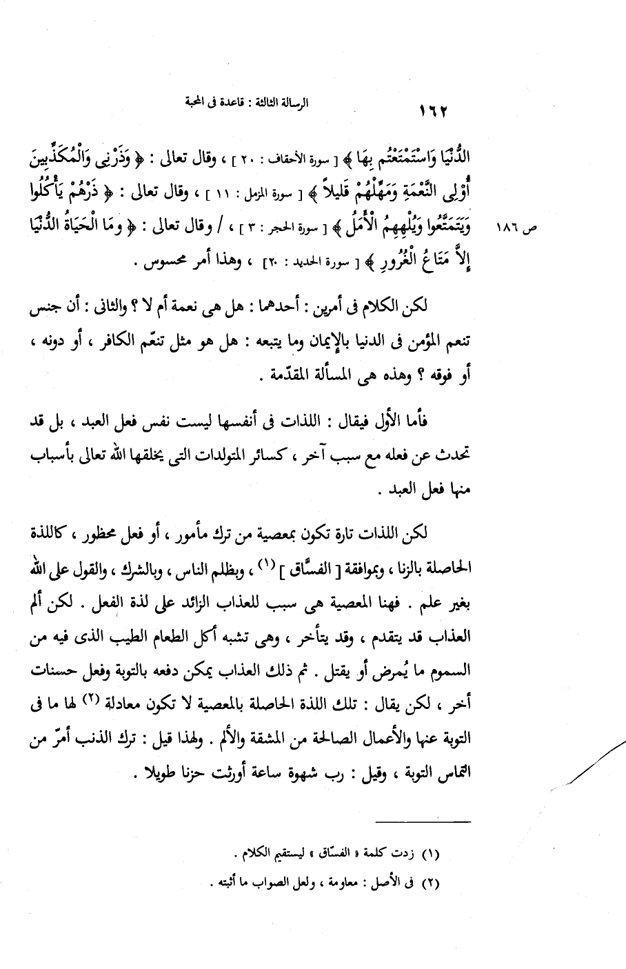 لكن اللذات تارة تكون بمعصية من ترك مأمور أو فعل محظور كاللذة الحاصلة بالزنا وبموافقة الفساق وبظلم الناس وبالشرك والقول على الله بغير علم فهنا المعصية هي سبب للعذاب الزائد على لذة الفعل لكن ألم العذاب قد يتقدم وقد يتأخر وهي تشبه أكل الطعام الطيب الذي فيه من السموم ما يمرض أو يقتل ثم ذلك العذاب يمكن دفعه بالتوبة وفعل حسنات أخر لكن يقال تلك اللذة الحاصلة بالمعصية لا تكون معادلة لها ما في التوبة عنها والأعمال الصالحة من المشقة والألم ولهذا قيل ترك الذنب أمر من التماس التوبة وقيل رب شهوة ساعة أورثت حزنا طويلا