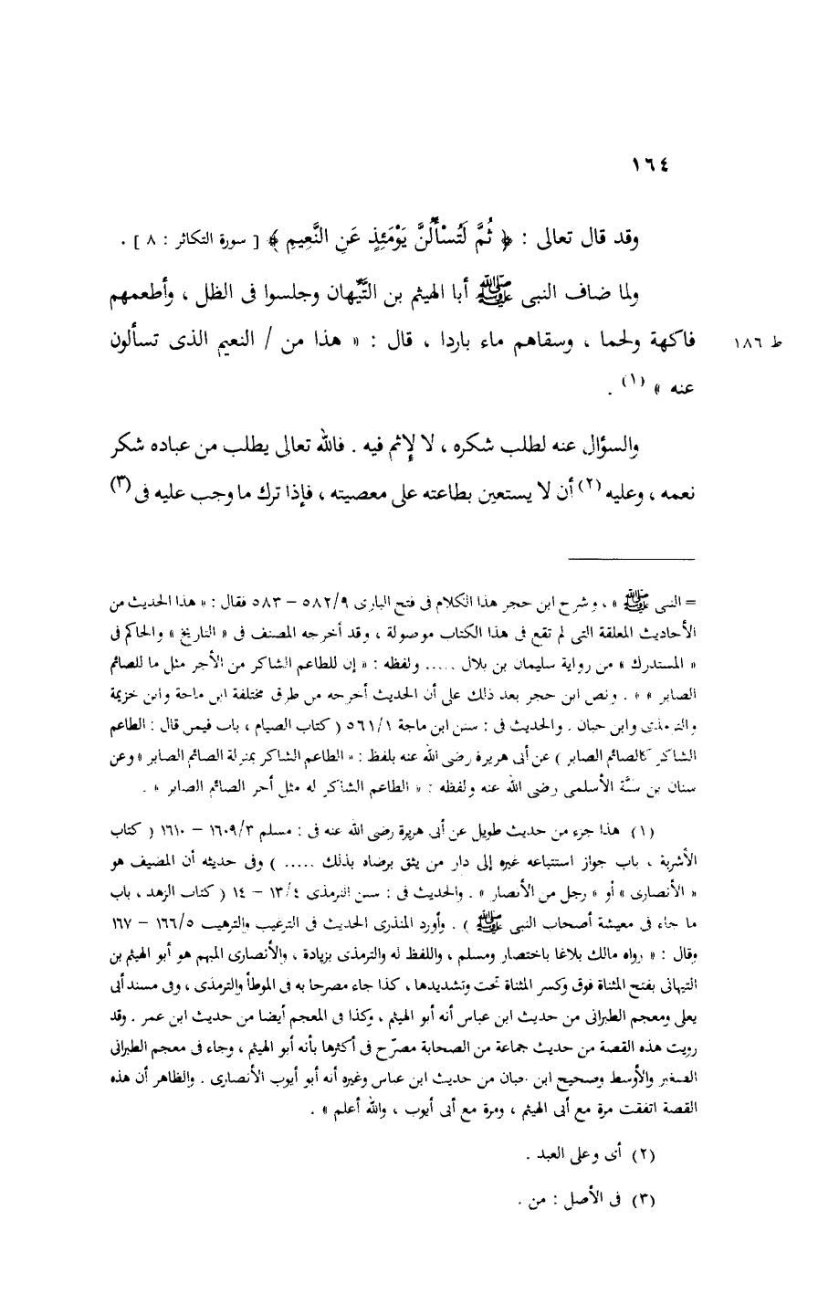 ولما ضاف النبي صلى الله عليه وسلم أبا الهيثم بن التيهان وجلسوا في الظل وأطعمهم فاكهة ولحما وسقاهم ماء باردا قال هذا من النعيم الذي تسألون عنه