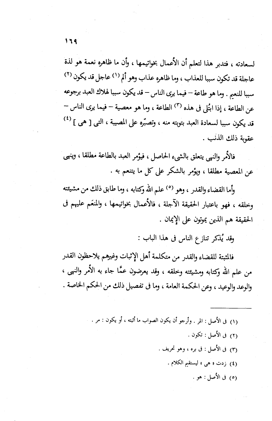 وأما القضاء والقدر وهو علم الله وكتابه وما طابق ذلك من مشيئته وخلقه فهو باعتبار الحقيقة الآجلة فالأعمال بخواتيمها والمنعم عليهم في الحقيقة هم الذين يموتون على الإيمان