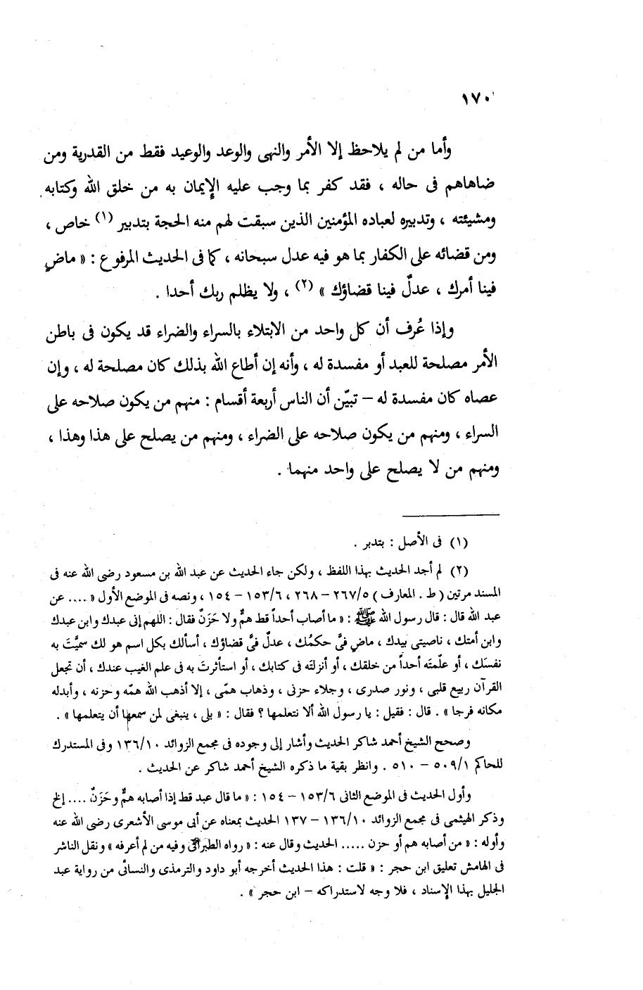 وأما من لم يلاحظ إلا الأمر والنهي والوعد والوعيد فقط من القدرية ومن ضاهاهم في حاله فقد كفر بما وجب عليه الإيمان به من خلق الله وكتابه ومشيئته وتدبيره لعباده المؤمنين الذين سبقت لهم منه الحجة بتدبير خاص ومن قضائه على الكفار بما هو فيه عدل سبحانه كما في الحديث المرفوع ماض فينا أمرك عدل فينا قضاؤك ولا يظلم ربك أحدا