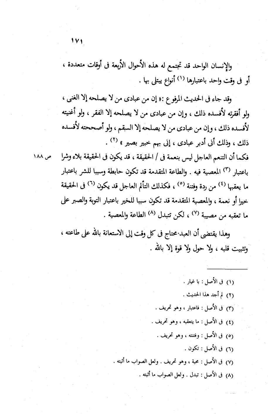 وقد جاء في الحديث المرفوع " أن من عبادي من لا يصلحه إلا الغني ولو أفقرته لأفسده ذلك وإن من عبادي من لا يصلحه إلا الفقر ولو أغنيته لأفسده ذلك وإن من عبادي من لا يصلحه إلا السقم ولو أصححته لأفسده ذلك وذلك أني أدبر عبادي إني بهم خبير بصير"