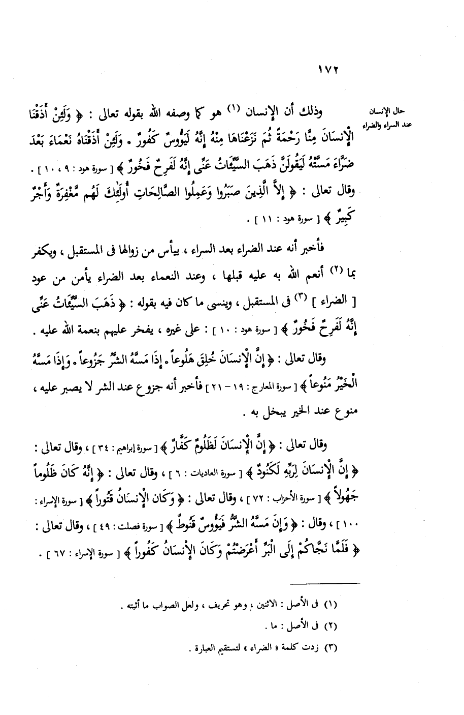 وقال تعالى: {إِنَّ الْأِنْسَانَ لَظَلُومٌ كَفَّارٌ} وقال تعالى: {إِنَّ الْأِنْسَانَ لِرَبِّهِ لَكَنُودٌ} وقال تعالى: {إِنَّهُ كَانَ ظَلُوماً جَهُولاً} وقال تعالى: {وَكَانَ الأِنْسَانُ قَتُوراً} وقال {وَإِنْ مَسَّهُ الشَّرُّ فَيَؤُوسٌ قَنُوطٌ} وقال تعالى: {فَلَمَّا نَجَّاكُمْ إِلَى الْبَرِّ أَعْرَضْتُمْ وَكَانَ الْأِنْسَانُ كَفُوراً}