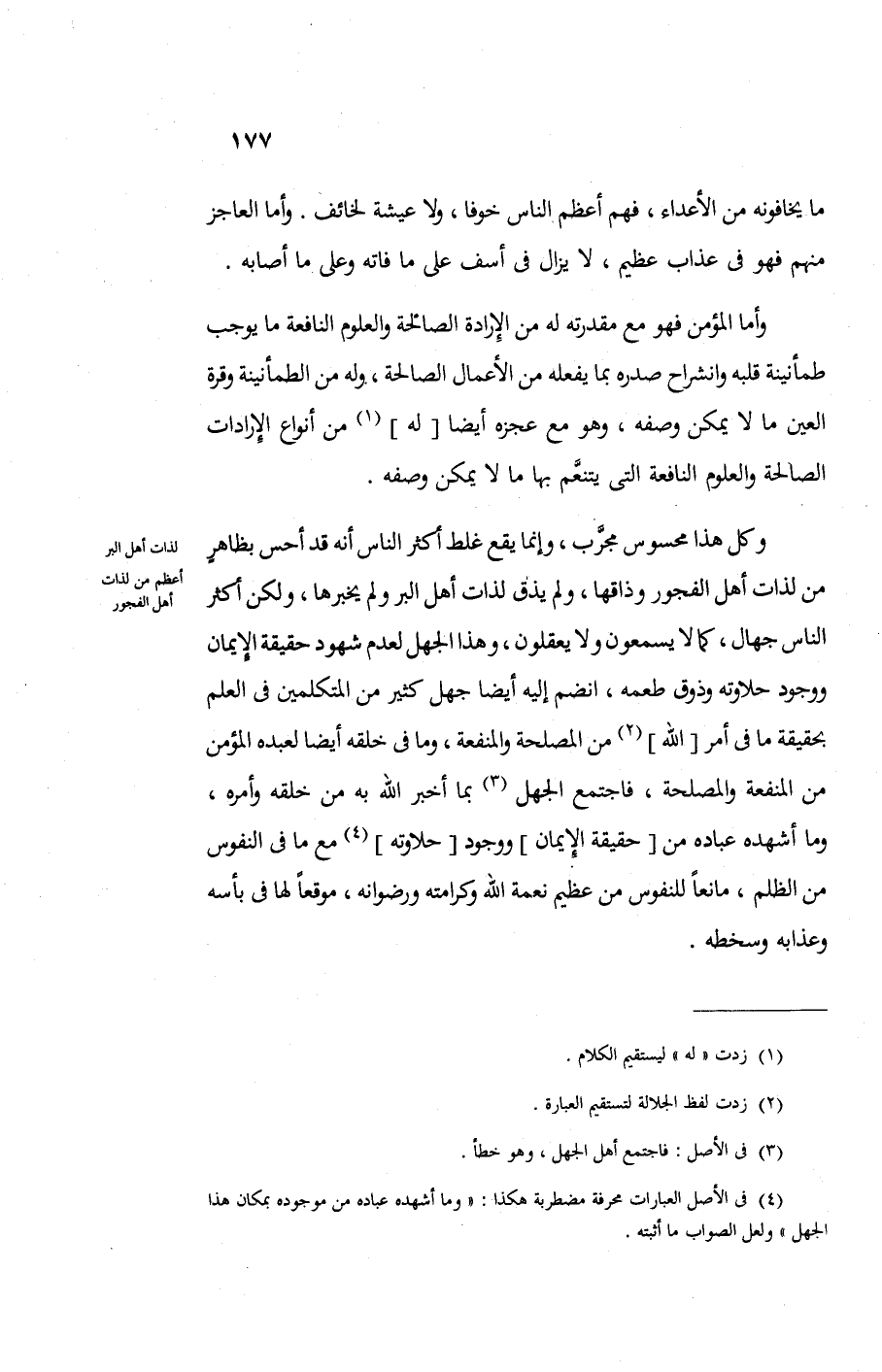 وكل هذا محسوس مجرب وإنما يقع غلط أكثر الناس أنه قد أحس بظاهر من لذات أهل الفجور وذاقها ولم يذق لذات أهل البر ولم يخبرها ولكن أكثر الناس جهال كما لا يسمعون ولا يعقلون وهذا الجهل لعدم شهود حقيقة الإيمان ووجود حلاوته وذوق طعمه انضم إليه أيضا جهل كثير من المتكلمين في العلم بحقيقة ما في أمر الله من المصلحة والمنفعة وما في خلقه أيضا لعبده المؤمن من المنفعة والمصلحة فاجتمع الجهل بما أخبر الله به من خلقه وأمره وما أشهده عباده من حقيقة الإيمان ووجود حلاوته مع ما في النفوس من الظلم مانعا للنفوس من عظيم نعمة الله وكرامته ورضوانه موقعا لها في بأسه وعذابه وسخطه