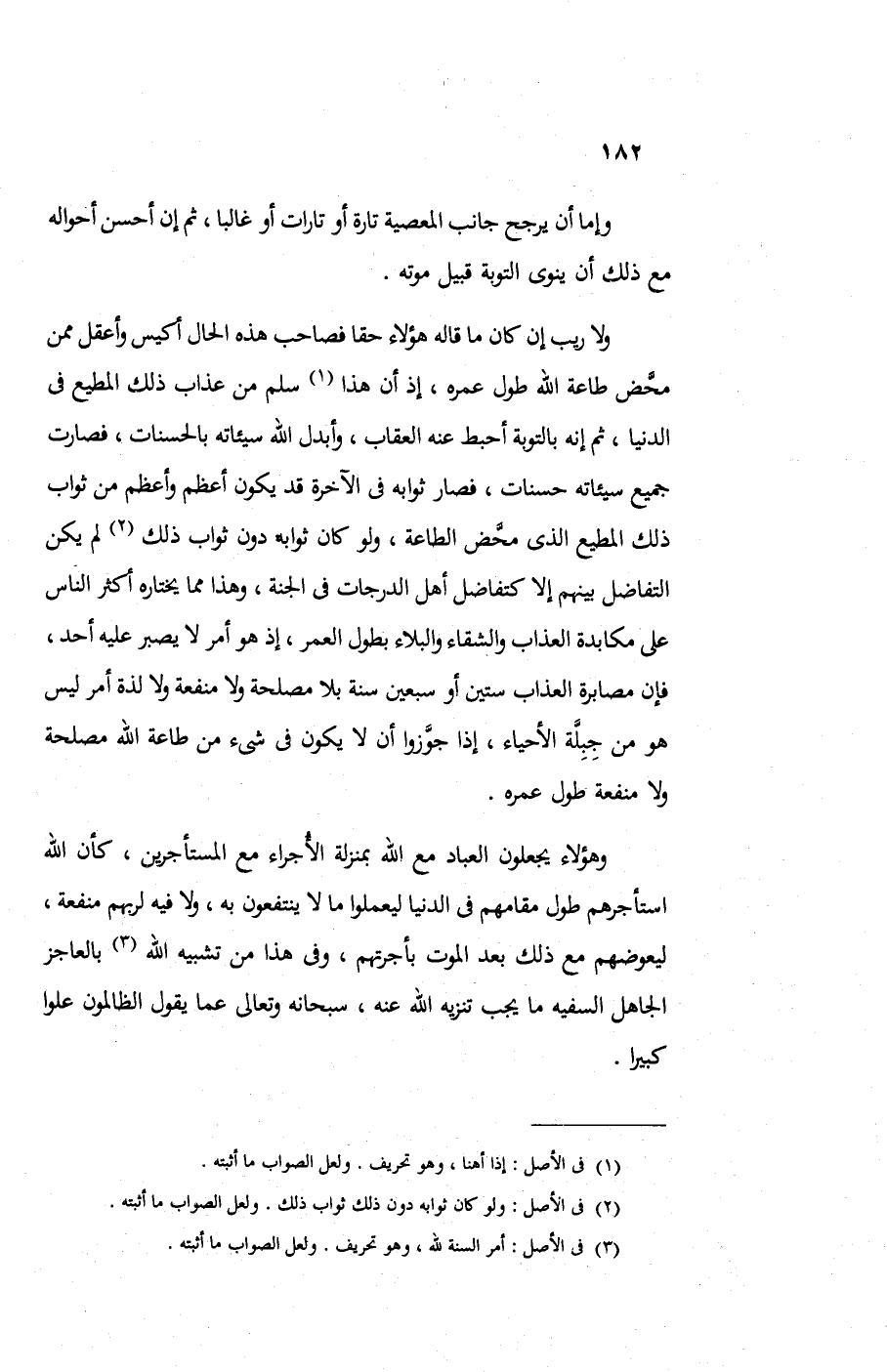وهؤلاء يجعلون العباد مع الله بمنزلة الأجراء مع المستأجرين كأن الله أستأجرهم طول مقامهم في الدنيا ليعملوا ما لا ينتفعون به ولا فيه لربهم منفعة ليعوضهم مع ذلك بعد الموت بأجرتهم وفي هذا من تشبيه الله بالعاجز الجاهل السفيه ما يجب تنزيه الله عنه سبحانه وتعالى عما يقول الظالمون علوا كبيرا