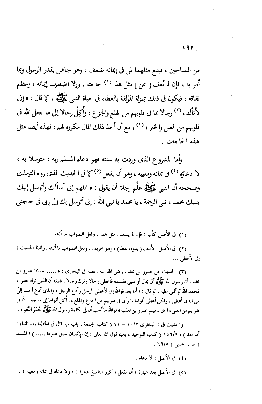من الصالحين فيقع مثلهما لمن في إيمانه ضعف وهو جاهل بقدر الرسول وبما امر به فإن لم يعف عن مثل هذا لحاجته وإلا اضطرب إيمانه وعظم نفاقه فيكون في ذلك بمنزلة المؤلفة بالعطاء في حياة النبي صلى الله عليه وسلم كما قال: " إني لأتألف رجالا بما في قلوبهم من الهلع والجزع وأكل رجالا إلى ما جعل الله في قلوبهم من الغني والخير" مع أن أخذ ذلك المال مكروه لهم فهذه أيضا مثل هذه الحاجات