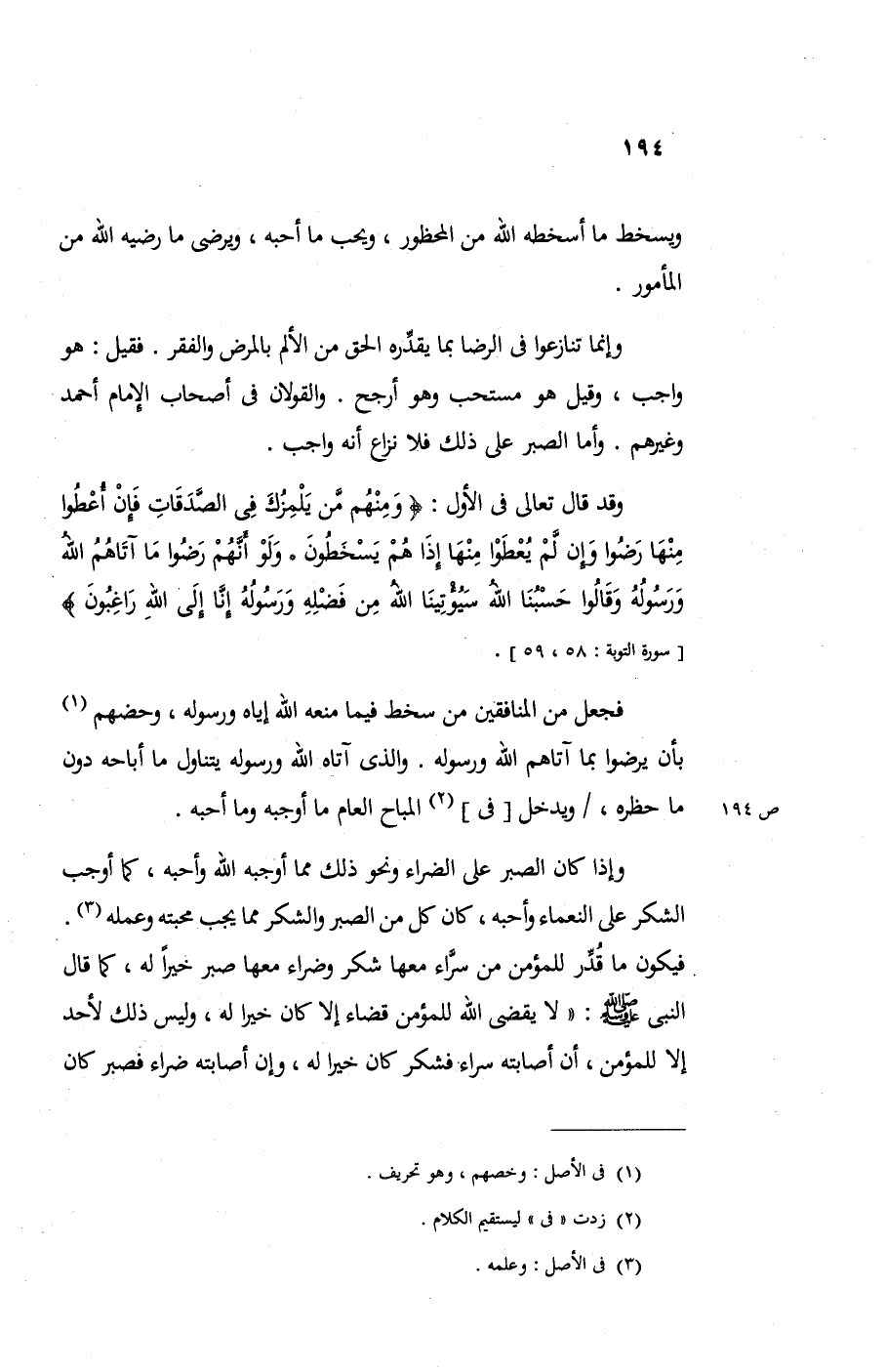 وإنما تنازعوا في الرضا بما يقدره الحق من الألم بالمرض والفقر فقيل هو واجب وقيل هو مستحب وهو أرجح والقولان في أصحاب الإمام احمد وغيرهم وأما الصبر على ذلك فلا نزاع أنه واجب