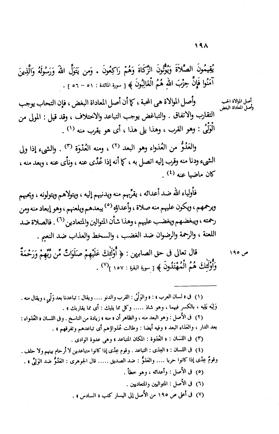 وأصل الموالاة هي المحبة كما أن أصل المعاداة البغض فإن التحاب يوجب التقارب والاتفاق والتباغض يوجب التباعد والاختلاف وقد قيل المولي من الولي وهو القرب وهذا يلي هذا أي هو يقرب منه