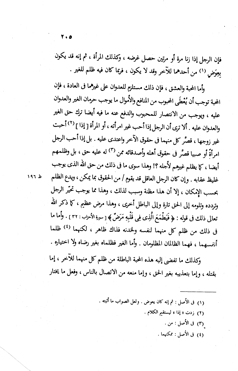 وأما المحبة والعشق فإن ذلك مستلزم للعدوان على غيرهما في العادة فإن المحبة توجب أن يعطي المحبوب من المنافع والأموال ما يوجب حرمان الغير والعدوان عليه ويوجب من الانتصار للمحبوب والدفع عنه ما فيه أيضا ترك حق الغير والعدوان عليه ألا تري أن الرجل إذا أحب غير امرأته أو المرأة إذا أحبت غير زوجها قصر كل منهما في حقوق الآخر واعتدي عليه بل إذا أحب الرجل امرأة أو صبيا قصر في حقوق أهله وأصدقائه ممن له عليه حق بل وظلمهم أيضا كما يظلم غيرهم لأجله وهذا سوى ما في ذلك من حق الله الذي يوجب غليظ عقابه وإن كان الرجل العاقل قد يقوم من الحقوق بما يمكن ويدع الظلم بحسب الإمكان إلا أن هذا مظنة وسبب لذلك وهذا مما يوجب تحير الرجل وتردده وتلومه إلى الحق تارة وإلى الباطل أخرى وهذا مرض عظيم كما ذكر الله تعالى ذلك في قوله {فَيَطْمَعَ الَّذِي فِي قَلْبِهِ مَرَضٌ} وأما ما في ذلك من ظلم كل منهما لنفسه ولخدنه فذاك ظاهر لكنهما ظلما أنفسهما فهما الظالمان المظلومان وأما الغير فظلماه بغير رضاه ولا اختياره