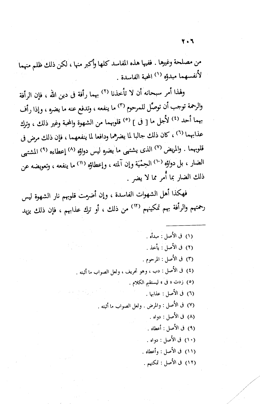 ولهذا أمر سبحانه أن لا تأخذنا بهما رأفه في دين الله فإن الرأفة والرحمة توجب أن توصل للمرحوم ما ينفعه وتدفع عنه ما يضره وإذا رأف بهما أحد لأجل ما في قلوبهما من الشهوة والمحبة وغير ذلك وترك عذابهما كان ذلك جالبا لما يضرهما ودافعا لما ينفعهما فإن ذلك مرض في قلوبهما والمريض الذي يشتهي ما يضره ليس دواؤه إعطاءه المشتهي الضار بل دواؤه الحمية وإن آلمته وإعطاؤه ما ينفعه وتعويضه عن ذلك الضار بما أمر مما لا يضر