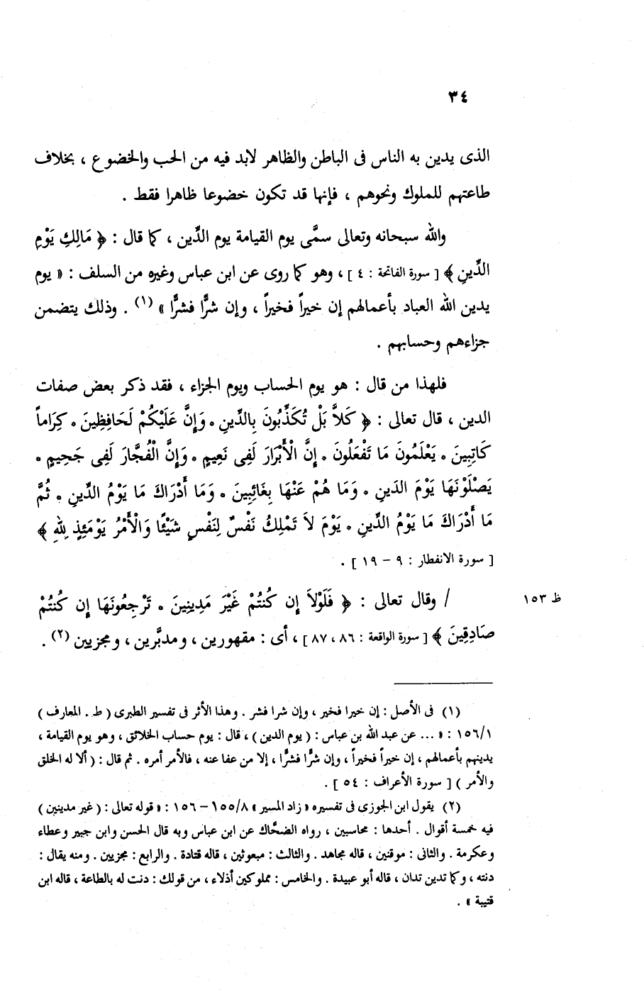 فلهذا من قال هو يوم الحساب ويوم الجزاء فقد ذكر بعض صفات الدين قال تعالى: {كَلا بَلْ تُكَذِّبُونَ بِالدِّينِ. وَإِنَّ عَلَيْكُمْ لَحَافِظِينَ.كِرَاماً كَاتِبِينَ. يَعْلَمُونَ مَا تَفْعَلُونَ. إِنَّ الأَبْرَارَ لَفِي نَعِيمٍ. وَإِنَّ الْفُجَّارَ لَفِي جَحِيمٍ. يَصْلَوْنَهَا يَوْمَ الدِّينِ. وَمَا هُمْ عَنْهَا بِغَائِبِينَ. وَمَا أَدْرَاكَ مَا يَوْمُ الدِّينِ. ثُمَّ مَا أَدْرَاكَ مَا يَوْمُ الدِّينِ. يَوْمَ لَا تَمْلِكُ نَفْسٌ لِّنَفْسٍ شَيْئاً وَالأَمْرُ يَوْمَئِذٍ لِلَّهِ}