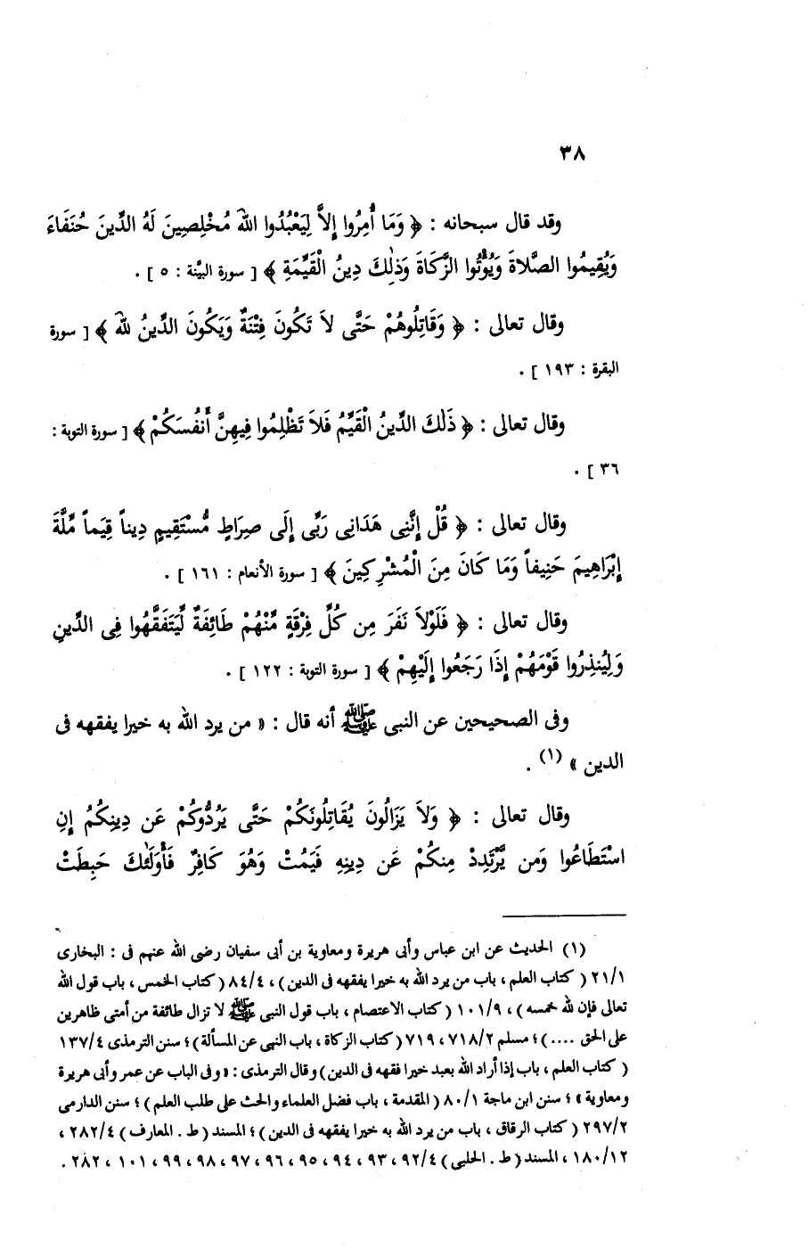 وقال تعالى: {قُلْ إِنَّنِي هَدَانِي رَبِّي إِلَى صِرَاطٍ مُسْتَقِيمٍ دِيناً قِيَماً مِلَّةَ إِبْرَاهِيمَ حَنِيفاً وَمَا كَانَ مِنَ الْمُشْرِكِينَ}