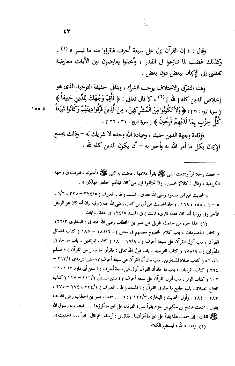 وقال " إن القرآن نزل على سبعة أحرف فاقرؤوا منه ما تيسر" وكذلك غضب لما تنازعوا في القدر وأخذوا يعارضون بين الآيات معارضة تفضي إلى الإيمان ببعض دون بعض