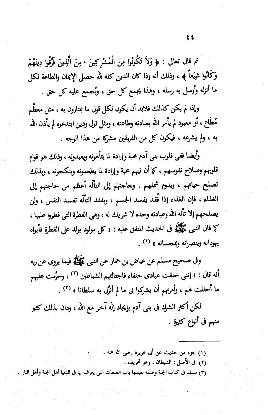 وفي صحيح مسلم عن عياض بن حمار عن النبي صلى الله عليه وسلم فيما يروي عن ربه أنه قال: "إنني خلقت عبادي حنفاء فاجتالتهم الشياطين وحرمت عليهم ما أحللت لهم وأمرتهم أن يشركوا بي ما لم أنزل به سلطانا".