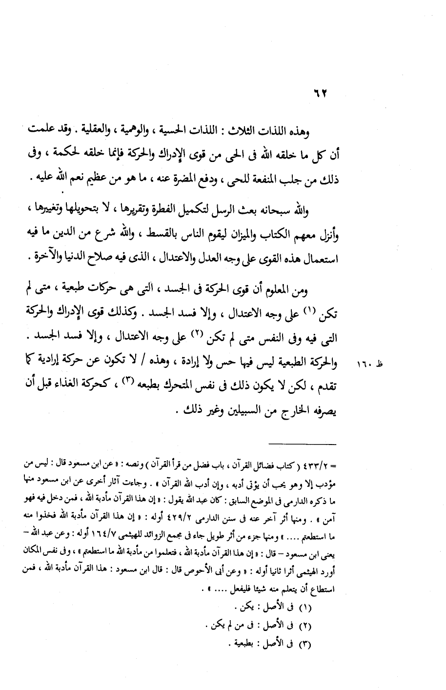 ومن المعلوم أن قوي الحركة في الجسد التي هي حركات طبعية متى لم تكن على وجه الاعتدال وإلا فسد الجسد وكذلك قوي الإدراك والحركة التي فيه وفي النفس متى لم تكن على وجه الاعتدال وإلا فسد الجسد والحركة الطبعية ليس فيها حس ولا إرادة وهذه لا تكون عن حركة إرادية كما تقدم لكن لا يكون ذلك في نفس المتحرك بطبعه كحركة الغذاء قبل أن يصرفه الخارج من السبيلين وغير ذلك