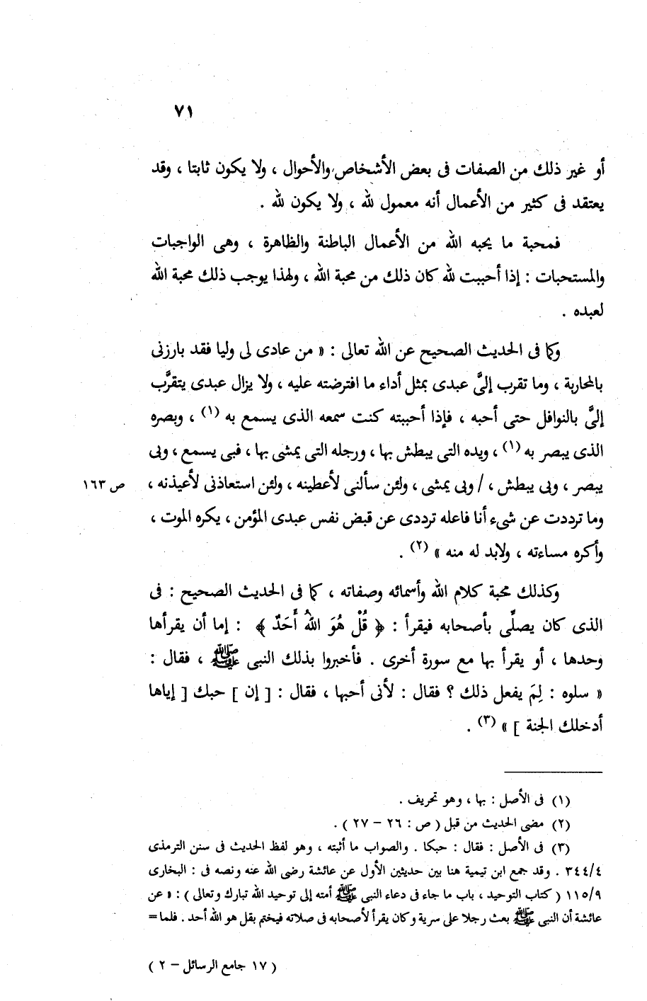 وكذلك محبة كلام الله وأسمائه وصفاته كما في الحديث الصحيح في الذي كان يصلي بأصحابه فيقرأ {قُلْ هُوَ اللَّهُ أَحَدٌ} إما أن يقرأها وحدها أو يقرأ بها مع سورة أخري فأخبروا بذلك النبي صلى الله عليه وسلم صلي الله عليه وسلم فقال: "سلوه لم يفعل ذلك فقال لأني أحبها فقال أن حبك إياها أدخلك الجنة".