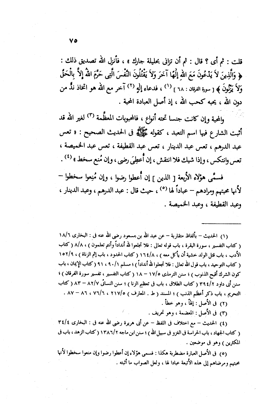 قلت ثم أي قال ثم أن تزني بحليلة جارك فأنزل الله تصديق ذلك {وَالَّذِينَ لا يَدْعُونَ مَعَ اللَّهِ إِلَهاً آخَرَ وَلا يَقْتُلُونَ النَّفْسَ الَّتِي حَرَّمَ اللَّهُ إِلَّا بِالْحَقِّ وَلا يَزْنُونَ} " فدعاء إله آخر مع الله هو اتخاذ ند من دون الله يحبه كحب الله إذ أصل العبادة المحبة