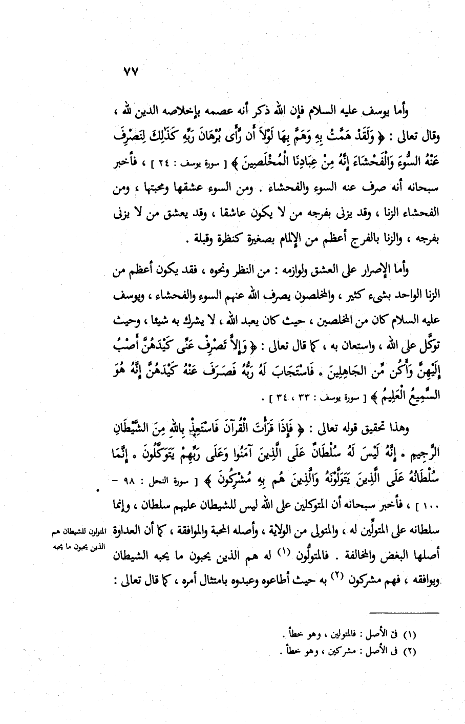 وأما الإصرار على العشق ولوازمه من النظر ونحوه فقد يكون أعظم من الزنا الواحد بشيء كثير والمخلصون يصرف الله عنهم السوء والفحشاء ويوسف عليه السلام كان من المخلصين حيث كان يعبد الله لا يشرك به شيئا وحيث توكل على الله واستعان به كما قال تعالى: {وَإِلَّا تَصْرِفْ عَنِّي كَيْدَهُنَّ أَصْبُ إِلَيْهِنَّ وَأَكُنْ مِنَ الْجَاهِلِينَ. فَاسْتَجَابَ لَهُ رَبُّهُ فَصَرَفَ عَنْهُ كَيْدَهُنَّ إِنَّهُ هُوَ السَّمِيعُ الْعَلِيمُ}