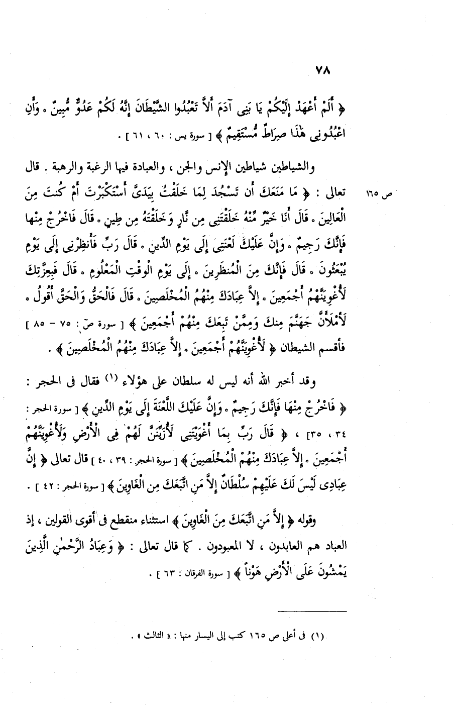 والشياطين شياطين الإنس والجن والعبادة فيها الرغبة والرهبة قال تعالى: {مَا مَنَعَكَ أَن تَسْجُدَ لِمَا خَلَقْتُ بِيَدَيَّ أَسْتَكْبَرْتَ أَمْ كُنتَ مِنَ الْعَالِينَ. قَالَ أَنَا خَيْرٌ مِّنْهُ خَلَقْتَنِي مِن نَّارٍ وَخَلَقْتَهُ مِن طِينٍ. قَالَ فَاخْرُجْ مِنْهَا فَإِنَّكَ رَجِيمٌ. وَإِنَّ عَلَيْكَ لَعْنَتِي إِلَى يَوْمِ الدِّينِ. قَالَ رَبِّ فَأَنظِرْنِي إِلَى يَوْمِ يُبْعَثُونَ. قَالَ فَإِنَّكَ مِنَ الْمُنظَرِينَ. إِلَى يَوْمِ الْوَقْتِ الْمَعْلُومِ. قَالَ فَبِعِزَّتِكَ لَأُغْوِيَنَّهُمْ أَجْمَعِينَ. إِلَّا عِبَادَكَ مِنْهُمُ الْمُخْلَصِينَ. قَالَ فَالْحَقُّ وَالْحَقَّ أَقُولُ. لَأَمْلَأَنَّ جَهَنَّمَ مِنكَ وَمِمَّن تَبِعَكَ مِنْهُمْ أَجْمَعِينَ} فأقسم الشيطان {لَأُغْوِيَنَّهُمْ أَجْمَعِينَ. إِلَّا عِبَادَكَ مِنْهُمُ الْمُخْلَصِينَ}
