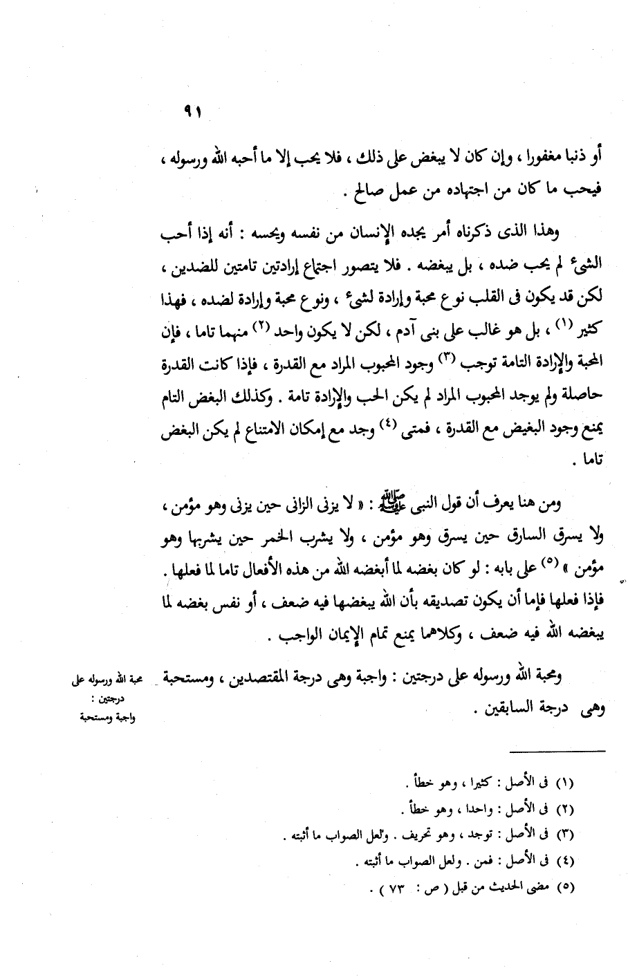 ومن هنا يعرف أن قول النبي صلى الله عليه وسلمصلى الله عليه وسلم: "لا يزني الزاني حين يزني وهو مؤمن ولا يسرق السارق حين يسرق وهو مؤمن ولا يشرب الخمر حين يشربها وهو مؤمن" , على بابه لو كان بغضه لما أبغضه الله من هذه الأفعال تاما لما فعلها فإذا فعلها فإما أن يكون تصديقه بأن الله يبغضها فيه ضعف أو نفس بغضه لما يبغضه الله فيه ضعف وكلاهما يمنع تمام الإيمان الواجب