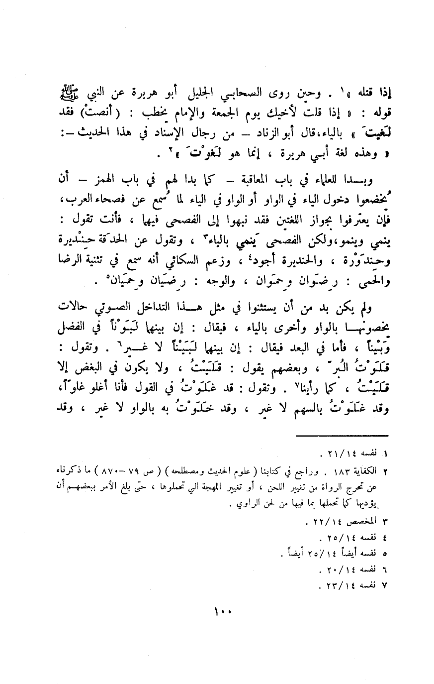 إذا قتله"1. وحين روى الصحابي الجليل أبو هريرة عن النبي -صلى الله عليه وسلم- قوله: "إذا قلت لأخيك يوم الجمعة والإمام يخطب: "أنصت" فقد لغيت" بالياء، قال أبو الزناد -من رجال الإسناد في هذا الحديث: "وهذه لغة أبي هريرة، إنما هو لغوت"2.