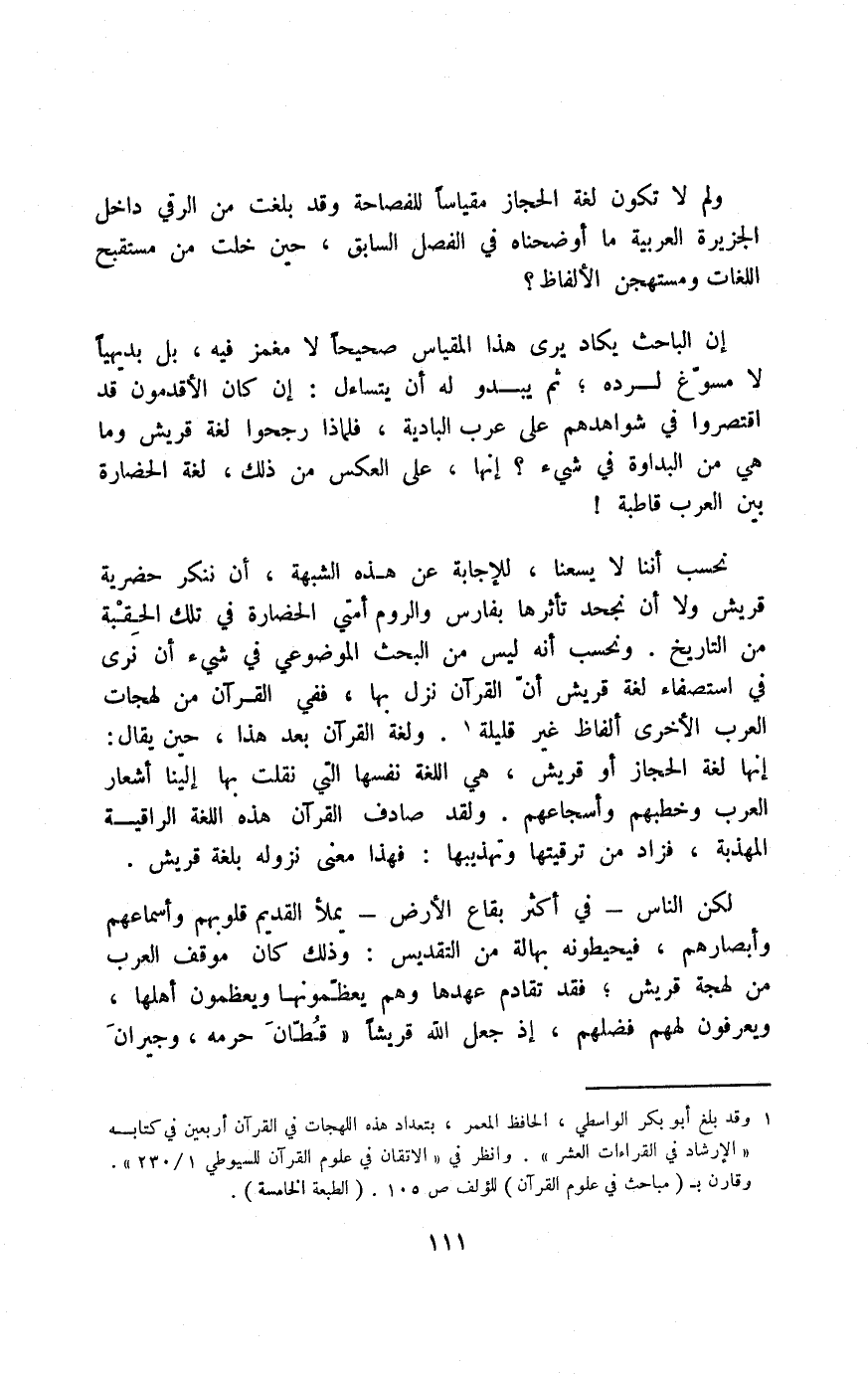 نحسب أننا لا يسعنا، للإجابة عن هذه الشبهة، أن ننكر حضرية قريش, ولا أن نجحد تأثرها بفارس والروم أمتي الحضارة في تلك الحقبة من التاريخ, ونحسب أنه ليس من البحث الموضوعي في شيء أن نرى في استصفاء لغة قريش أن القرآن نزل بها، ففي القرآن من لهجات العرب الأخرى ألفاظ غير قليلة1, ولغة القرآن بعد هذا، حين يقال: إنها لغة الحجاز أو قريش، هي اللغة نفسها التي نقلت بها إلينا أشعار العرب وخطبهم وأسجاعهم, ولقد صادق القرآن هذه اللغة الراقية المهذبة، فزاد من ترقيتها وتهذيبها, فهذا معنى نزوله بلغة قريش.