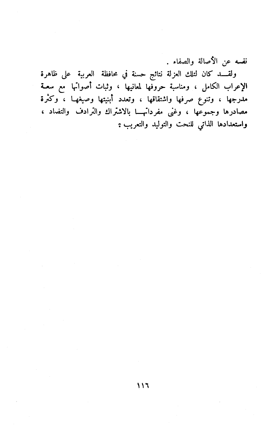 ولقد كان لتلك الغزلة نتائج حسنة في محافظة العربية على ظاهرة الإعراب الكامل، ومناسبة حروفها لمعانيها، وثبات أصواتها مع سعة مدرجها، وتنوع صرفها واشتقاقها، وتعدد أبنيتها وصيغها، وكثيرة مصادرها، وغنى مفرداتها بالاشتراك والترادف والتضاد، واستعدادها الذاتي للنحت والتوليد والتعريب.