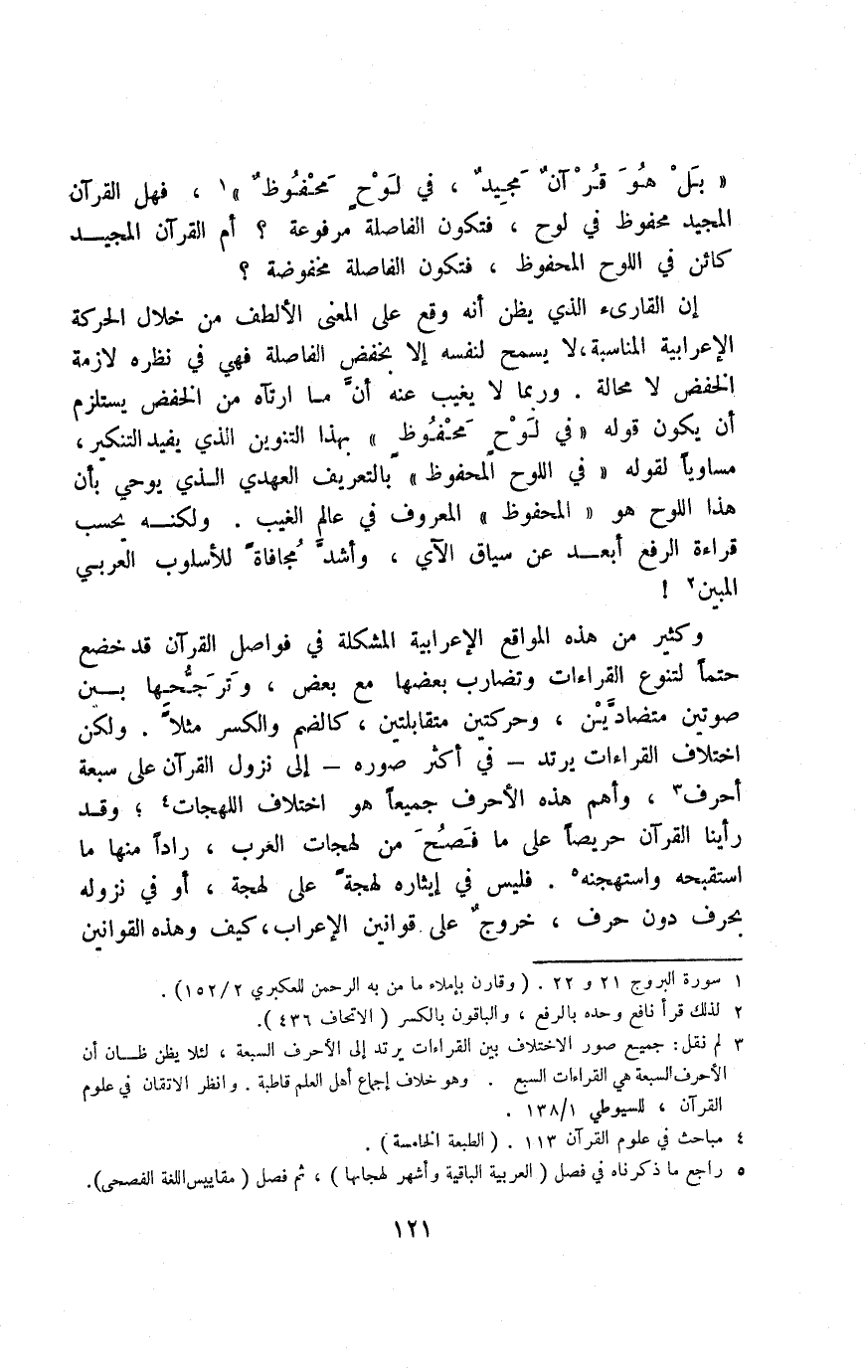 إن القارئ الذي يظن أنه وقع على المعنى الألطف من خلال الحركة الإعرابية المناسبة، لا يسمح لنفسه إلّا بخفض الفاصلة, فهي في نظره لازمة الحفض لا محال, وربما لا يغيب عنه أن ما ارتآه من الخفض يستلزم أن يكون قوله: {فِي لَوْحٍ مَحْفُوظٍ} بهذا التنوين الذي يفيد التنكير، مساويًا لقوله: "في اللوح المحفوظ" بالتعريف العهدي الذي يوحي بأن هذا اللوح هو "المحفوظ " المعروف في عالم الغيب, ولكنه يحسب قراءة الرفع أبعد عن سياق الآي، وأشدَّ مجافاةً للأسلوب العربيّ المبين2!