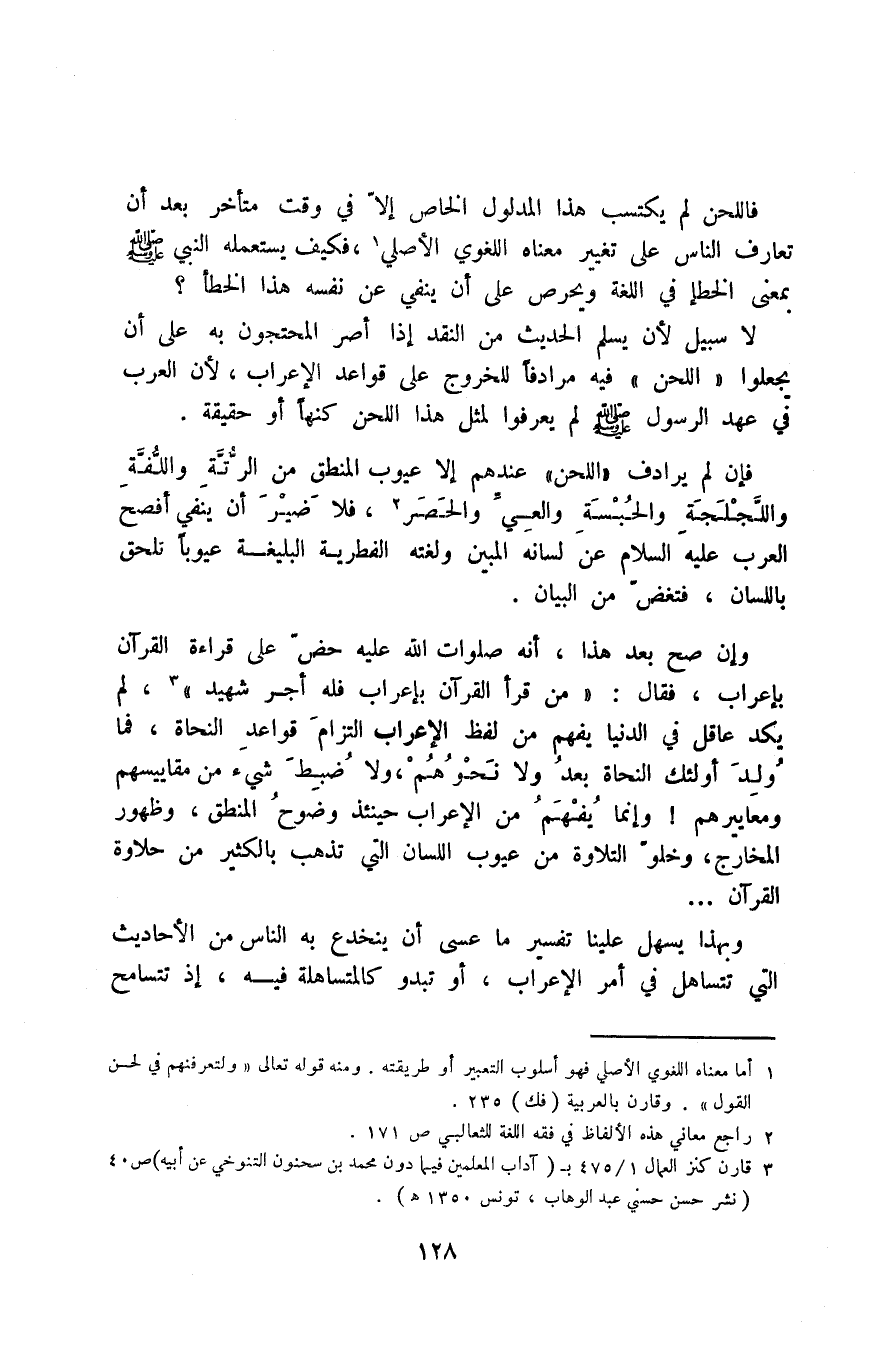 وإن صح بعد هذا، أنه -صلوات الله عليه- حضَّ على قراءة القرآن بإعراب، فقال: "من قرأ القرآن بإعراب فله أجر شهيد"3، لم يكد عاقل في الدنيا يفهم من لفظ الإعراب التزام قواعد النحاة، فما ولد أولئك النحاة بعد ولا نحوهم، ولا ضبط شيء من مقاييسهم ومعاييرهم! وإنما يفهم من الإعراب حينئذ وضوح المنطق، وظهور المخارج، وخلوّ التلاوة من عيوب اللسان التي تذهب بالكثير من حلاوة القرآن ...