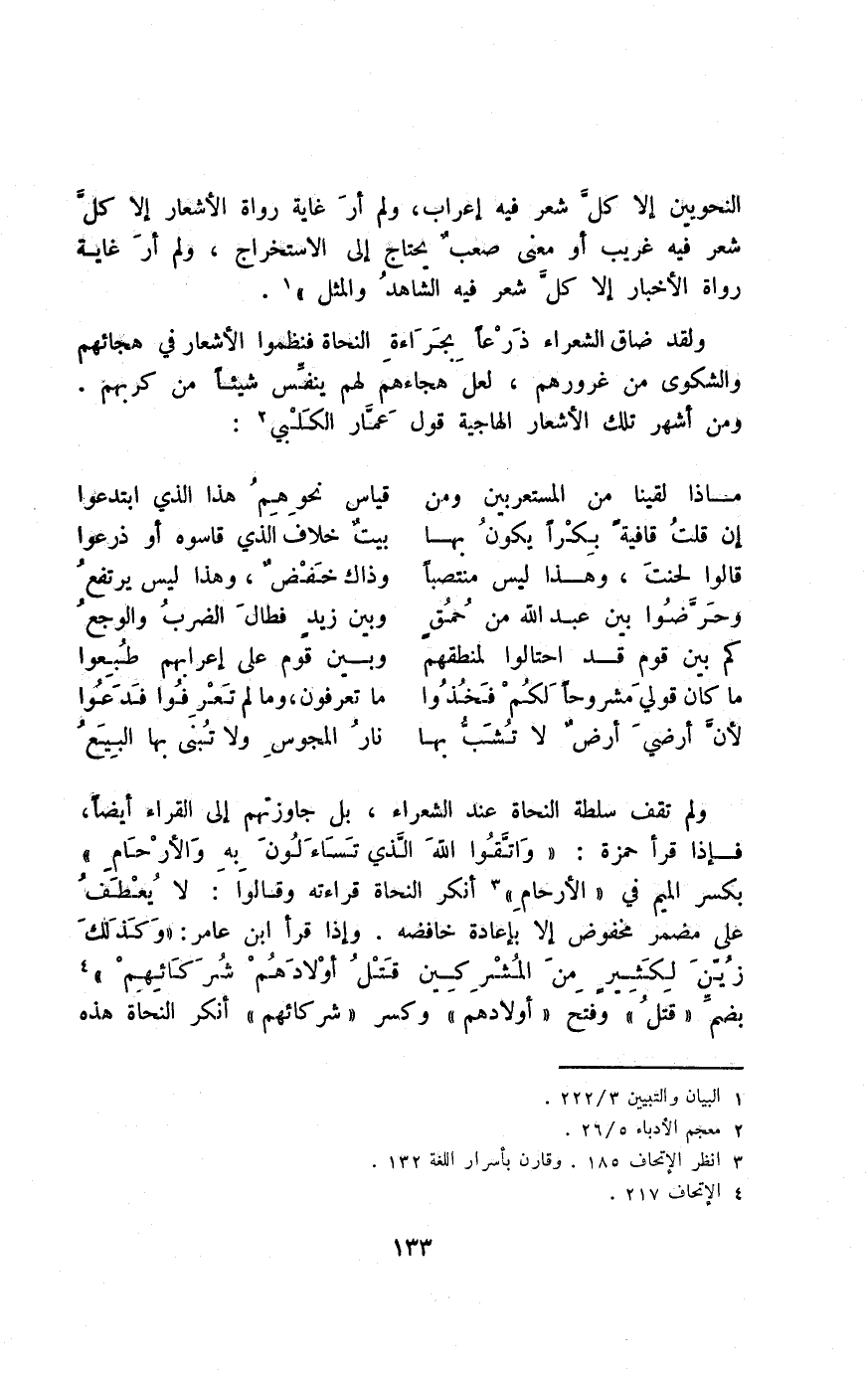 ولم تقف سلطة النحاة عند الشعراء، بل جاوزتهم إلى القراء أيضًا، فإذا قرأ حمزة: {وَاتَّقُوا اللَّهَ الَّذِي تَسَاءَلُونَ بِهِ وَالْأَرْحَامَ} بكسر الميم في "الأرحام"3 أنكر النحاة قراءته وقالوا: لا يعطف على مضمر مخفوضٍ إلا بإعادة خافضه, وإذا قرأ ابن عامر: {وَكَذَلِكَ زَيَّنَ لِكَثِيرٍ مِنَ الْمُشْرِكِينَ قَتْلَ أَوْلَادِهِمْ شُرَكَاؤُهُمْ} 4 بضم "قتل" وفتح "أولادهم" وكسر "شركائهم" أنكر النحاة هذه