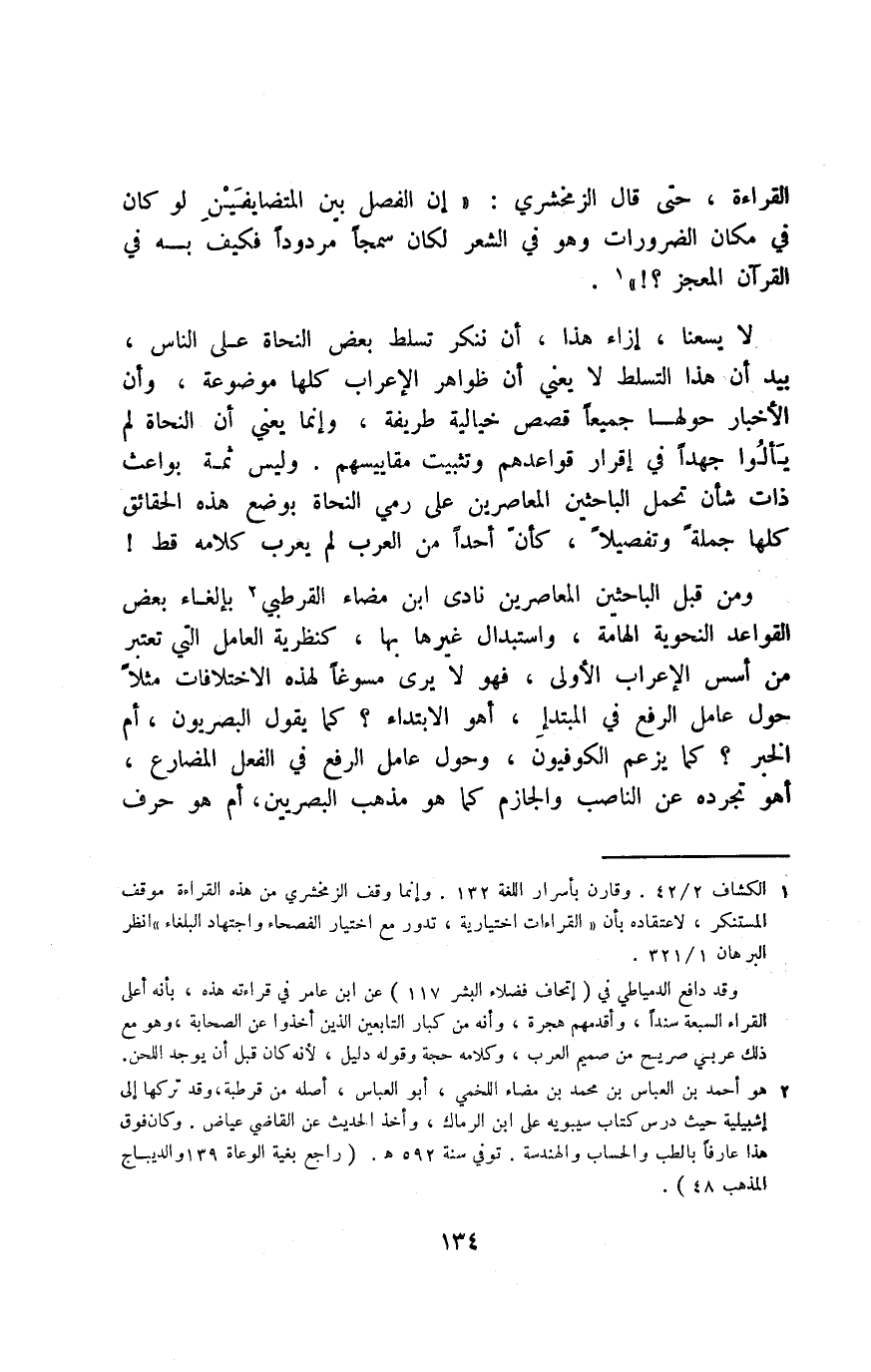 1 الكشاف 2/ 42, وقارن بأسرار اللغة 132, وإنما وقف الزمخشري من هذه القراءة موقف المستنكر، لاعتقاده بأن "القراءات اختيارية، تدور مع اختيار الفصحاء, واجتهاد البلغاء" انظر البرهان.