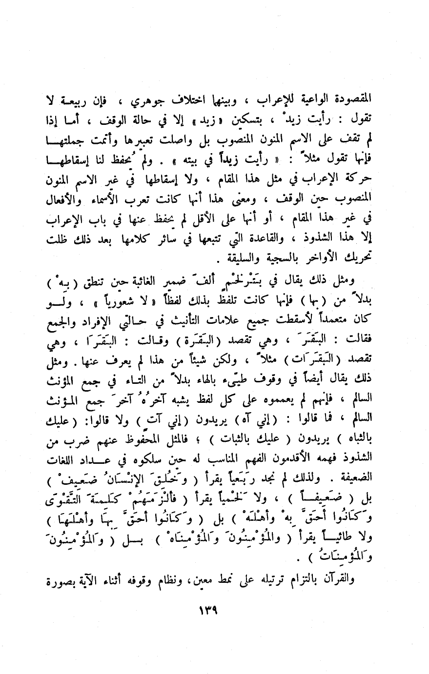 المقصودة الواعية للإعراب، وبينهما اختلاف جوهري، فإن ربيعة لا تقول: رأيت زيدْ، بتسكين "زيد" إلّا في حالة الوقف، أما إذا لم تقف على الاسم المنون المنصوب بل واصلت تعبيرها وأتمت جملتها, فإنها تقول مثلًا: "رأيت زيدًا في بيته". ولم يُحفظ لنا إسقاطها حركة الإعراب في مثل هذا المقام، ولا إسقاطها في غير الاسم المنوّن المنصوب حين الوقف، ومعنى هذا أنها كانت تعرب الأسماء والأفعال في غير هذا المقام، أو أنها على الأقل, لم يُحْفَظْ عنها في باب الإعراب إلّا هذا الشذوذ، والقاعدة التي تتبعها في سائر كلامها بعد ذلك ظلت تحريك الأواخر بالسجية والسليقة.
