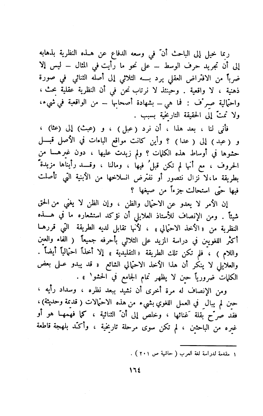 ربما خُيِّلَ إلى الباحث أن في وسعه الدفاع عن هذه النظرية بذهابه إلى أن تجريد حرف الوسط -على نحو ما رأيت في المثال- ليس إلّا ضربًا من الافتراض العقلي يرد به الثلاثي إلى أصله الثنائي في صورة ذهنية، لا واقعية, وحينئذ لا نرتاب نحن في أن النظرية عقلية بحث، واحتمالية صرف؛ فما هي -بشهادة أصحابها- من الواقعية في شيء، ولا تمت إلى الحقيقة التاريخية بسبب.