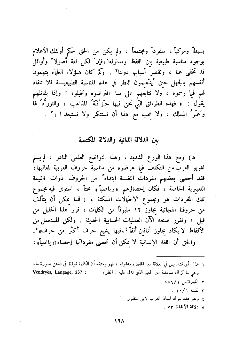 هـ- ومع هذا الورع الشديد، هذا التواضع العلمي النادر، لم يسلم لغويو العرب من التكلف فيما عرضوه من مناسبة حروف العربية لمعانيها، فقد أحصى بعضهم مفردات اللغة ابتداءً من الحروف ذوات القيمة التعبيرية الحاصة، فكان إحصاؤهم "رياضيًّا" بحتًا، استوى فيه مجموع تلك المفردات هو ومجموع الاحتمالات الممكنة، "فما يمكن أن يتألف من حروفنا الهجائية يجاوز 12 مليونًا من الكلمات، قرَّرَ هذا الخليل من قبل، وتقرر صنعه الآن العمليات الحسابية الحديثة, ولكن المستعمل من الألفاظ لا يكاد يجاوز ثمانين ألفًا4، فيها يشبع حرف أكثر من حرف"5.