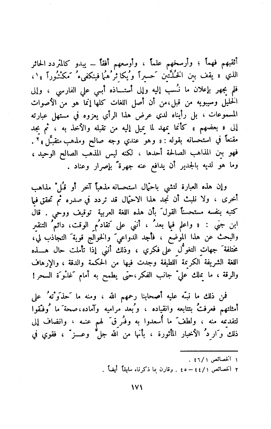 أثقبهم فهمًا؛ وأرسخهم علمًا، وأوسعهم أفقًا- يبدو كالمتردد الحائر الذي "يقف في الحالتين حسيرًا ويكاثرهما فينكفئ مكثورًا"1، فلم يجهر بإعلان ما نُسِبَ إليه وإلى أستاذه أبي عليّ الفارسي، وإلى الخليل وسيبويه من قبل من أنّ أصل اللغات كلها إنما هو من الأصوات المسوموعات، بل رأيناه لدى عرض هذا الرأي يعزوه في مستهلّ عبارته إلى بعضهم؛ كأنمما يمهد لما إليه من تقبله والأخذ به، ثم يجد مقنعًا في استحسانه بقوله: "وهو عندي وجه صالح ومذهب مُتَقَبَّلُ"2؛ فهو بين المذاهب الصالة أحدها, لكنه ليس المذهب الصالح الوحيد, وما هو لديه بالجدير أن يدافع عنه جهرة بإصرار وعناد.
