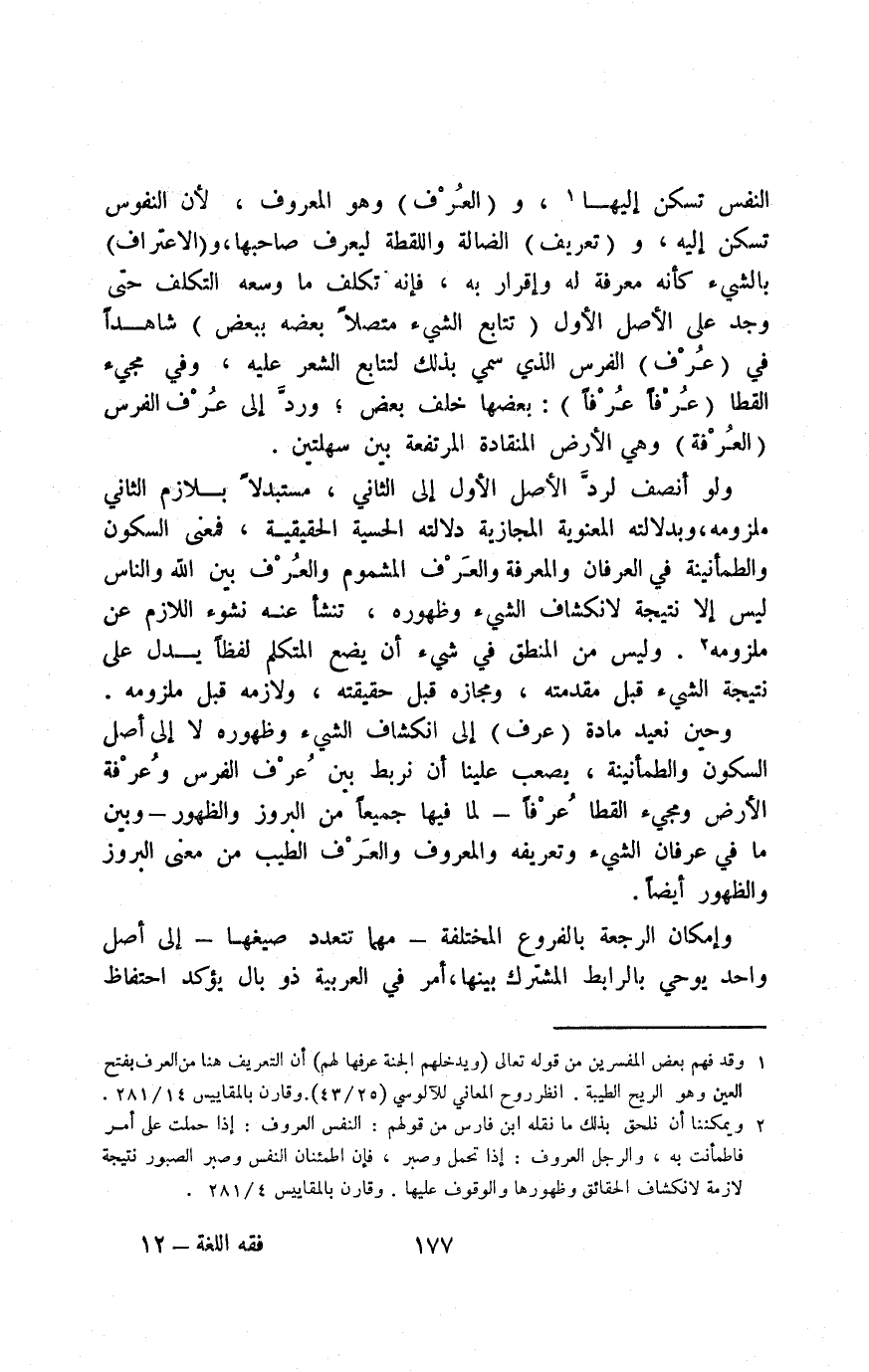 ولو أنصف لردَّ الأصل الأول إلى الثاني، مستبدلًا بلازم الثاني ملزمومه، وبدلالته المعنوية المجازية دلالته الحسية الحقيقية، فمعنى السكون والطمانينة في العِرْفَان والمعْرِفَة والعَرْف المشموم, والعُرْف بين الله والناس ليس إلّا نتيجةً لانكشاف الشيء وظهوره، تنشأ عنه نشوء الإلزم عن ملزومه2. وليس من المنطق في شيء أن يضع المتكلم لفظًا يدل على نتيجة الشيء قبل مقدمته، ومجازه قبل حقيقته، ولازمه قبل ملزومه.