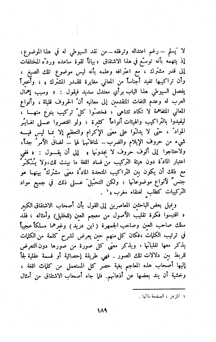 لا يسلم -رغم اعتداله وترفقه- من نقد السيوطي له في هذا الموضوع، إذ يتهمه بأنه توسَّعَ في هذا الاشتقاق "بيانًا لقوة ساعده, وردّه المختلفات إلى قدر مشترك، مع اعترافه وعلمه بأنه ليس موضوع تلك الصيغ، وأن تراكيبها تفيد أجناسًا من المعاني مغايرة للقدر المشترك"؛ وأخيرًا يفصل السيوطي هذا الباب برأيٍ معتدلٍ سديدٍ فيقول: "وسبب إهمال العرب له, وعدم التفات المتقدمين إلى معانيه, أن الحروف قليلة، وأنواع المعاني المتفاهمة لا تكاد تتناهى؛ فخصوا كل تركيب بنوع منها، ليفيدوا بالتراكيب والهيئات أنواعًا كثيرة؛ ولو اقتصروا على تغاير المواد، حتى لا يدلوا على معنى الإكرام والتعظيم إلّا بما ليس فيه شيء من حروف الإيلام والضرب -لمنافاتها لهما- لضاق الأمر جدًّا، ولاحتاجوا إلى ألوف حروف لا يجدونها" إلى أن يقول: "ففي اعتباره المادة دون هيئة التركيب من فساد اللغة ما بينت لك، ولا يُنْكَرُ مع ذلك أن يكون بين التراكيب المتحدة المادة معنًى مشتركٌ بينها, هو جنس لأنواع موضوعاتها؛ ولكن التحيّل على ذلك في جميع مواد التركيبات كطلبٍ لعنقاء مغرب"1.