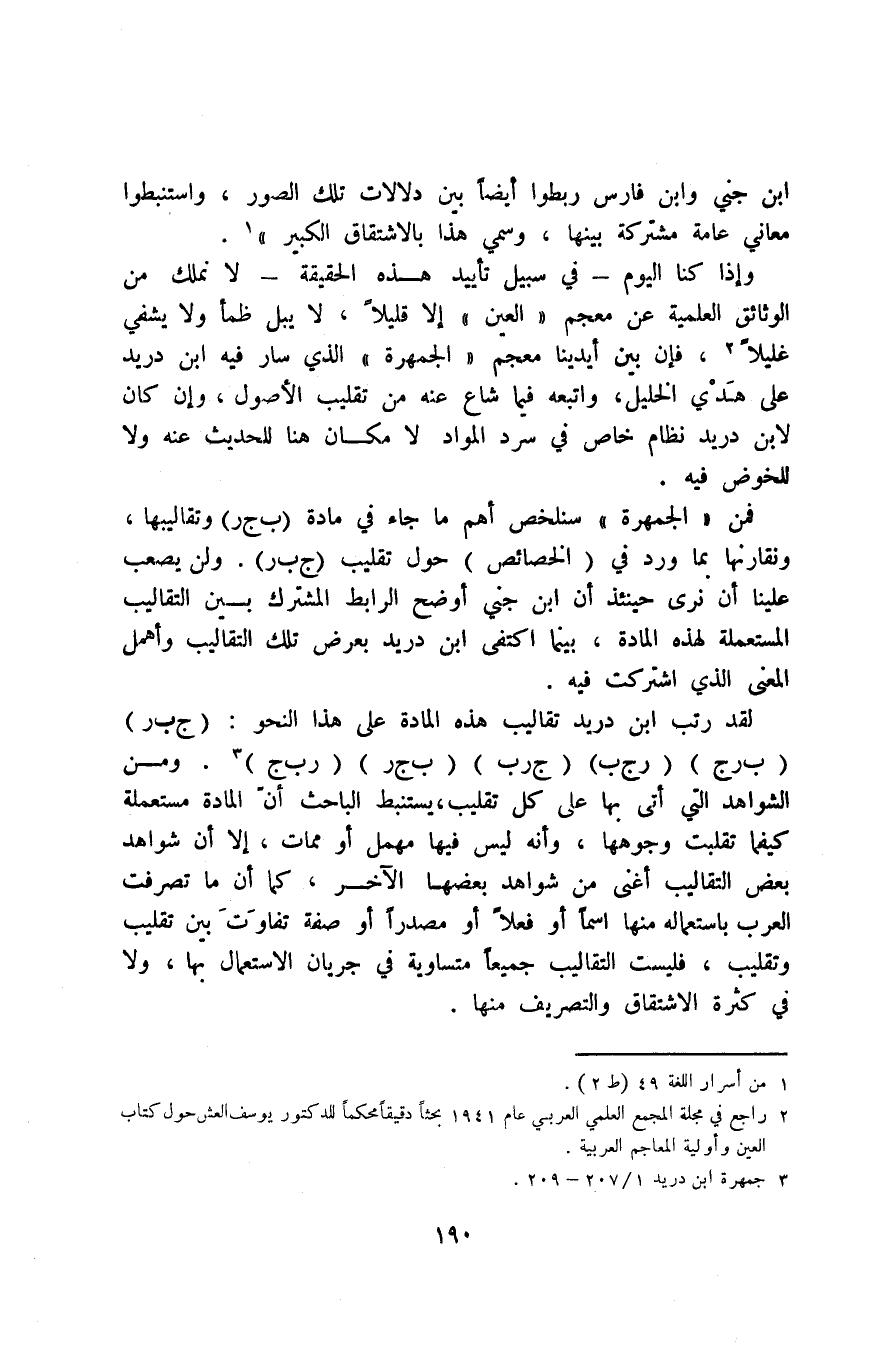 فمن "الجمهرة" سنلخص أهم ما جاء في مادة "ب ج ر" وتقاليبها، ونقارنها بما ورد في "الخصائص" حول تقليب "ج ب ر", ولن يصعب علينا أن نرى حينئذ أن ابن جني أوضح الرابط المشترك بين التقاليب المستعملة لهذه المادة, بينما اكتفى ابن دريد بعرض تلك التقاليب, وأهمل المعنى الذي اشتركت فيه.