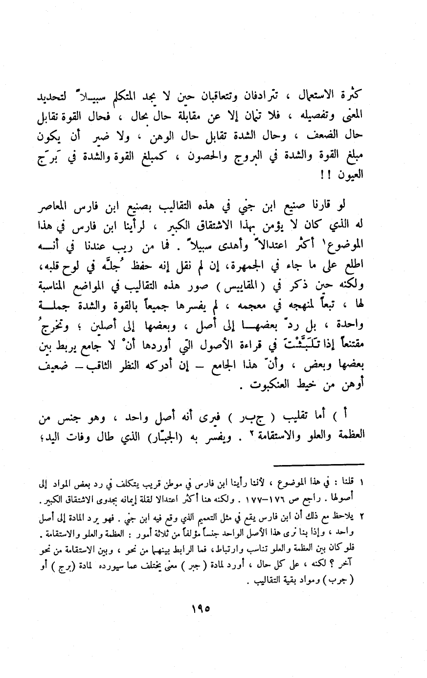 2 يلاحظ مع ذلك أن ابن فارس لم يقع في مثل التعميم الذي وقع فيه ابن جني, فهو يرد المادة إلى أصل واحد، وإذ بنا نرى هذا الأصل الواحد جنسًا مؤلفًا من ثلاثة أمور: العظمة والعلو والاستقامة.